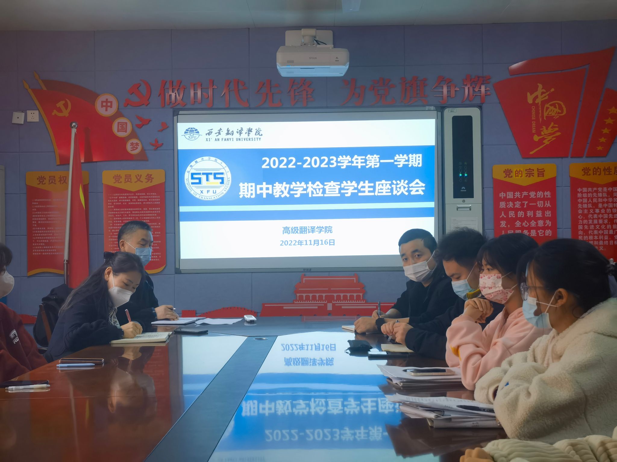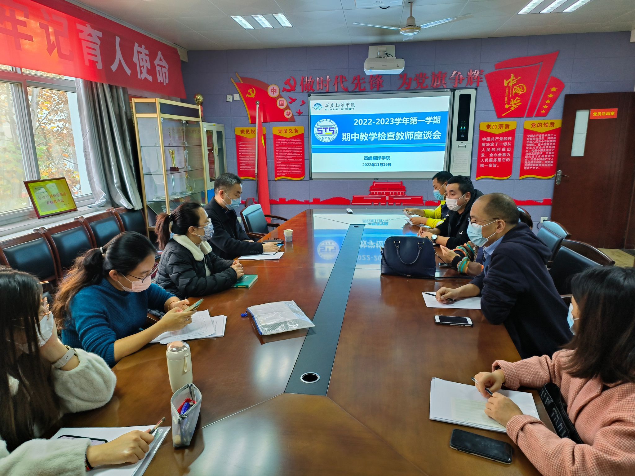 为做好2022-2023学年第1学期期中教学检查工作,深入了解本学期学院的教学情况和学生的学习情况,进一步提高教学质量,11月16日下午,高级翻译学院在西区2号楼会议室分别召开2022-2023学年第1学期期中教学检查学生座谈会和教师座谈会。教务处考籍科科长闫自超、部分教师代表、辅导员参加座谈会并与学生交流,座谈会分别由综合办副主任刘红娟、综合办教师李栋主持。
