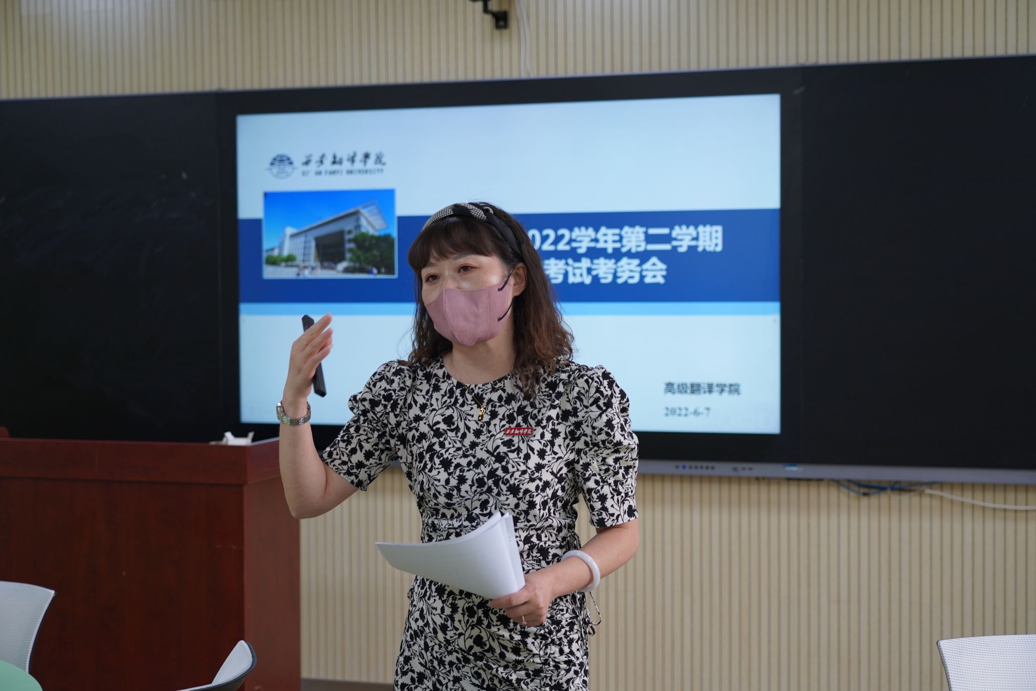 6月10日下午,高级翻译学院召开了2022年上半年全国大学英语四、六级考试暨2022年春季学期期末考试考务工作会。副院长张睿、综合办主任简实及全体教师参加了会议。会议由简实主持。