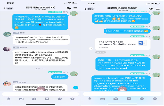 罗飞老师将交际翻译与语义翻译理论进行梳理,鼓励学生能够根据理论定义,结合自己的理解进行评价分析。对学生的分析,老师进行评价和总结并整理成文档发送给学生。