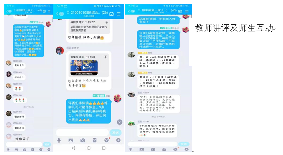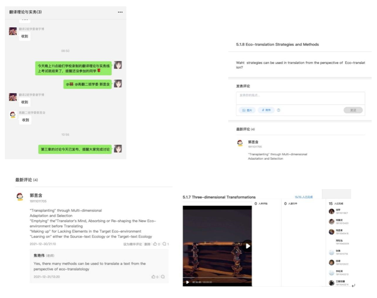 比如,2021级任蓓蓓老师所带《综合英语I》课程安排学生线上早读,早读内容为精读课本前3单元,将朗读最熟练的一段文字语音发到群里;郭小华和田径老师所带的《综合英语I》课程也安排了系列线上学习活动,生动有趣,充分调动学生参与度。各项活动学生有序开展,学生积极参与,师生线上互动热烈,收到了很好的教学和活动效果。