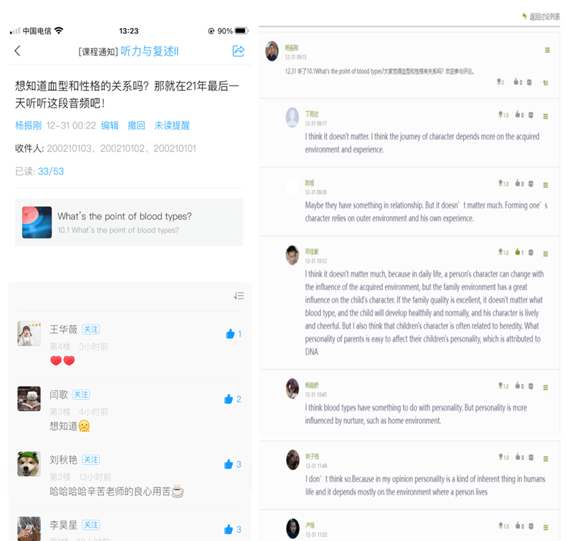 2020级杨振刚老师充分利用线上教学,精心设计《听力与复述II》课程教学内容、教学流程和教学活动,增加趣味性学习内容,以知识拓展和巩固为主,通过问题引导学生积极参与主题讨论,努力实现师生互动,构建有效的在线教学。