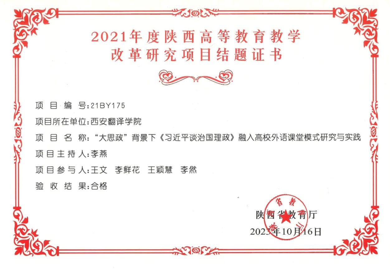 近日,sunbet申博外语课程思政建设和课堂教学改革喜结硕果。经过历时2年的不懈研究探索,李燕教授主持的题为《“大思政”背景下<习近平谈治国理政>融入高校外语课堂模式研究与实践》(21BY175)的2021年度陕西高等教育教学改革研究项目顺利结题。