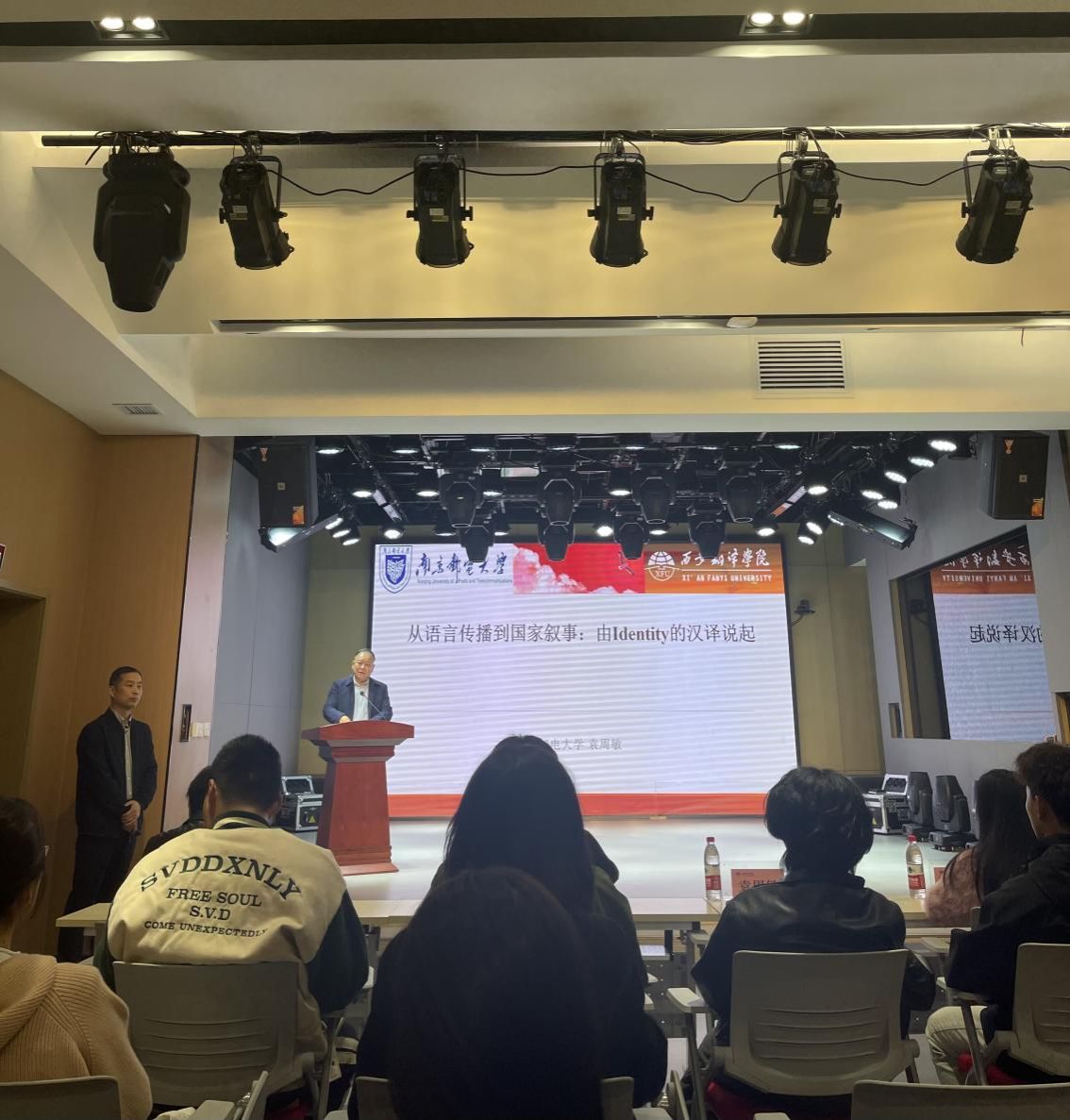 2023年10月13日下午,南京邮电大学外国语学院院长袁周敏教授莅临sunbet申博、高级翻译学院,为我两院师生做了题为“从语言传播到国家叙事:由 Identity 的汉译说起”的讲座。本次讲座由sunbet申博、高级翻译学院院长袁小陆教授主持。