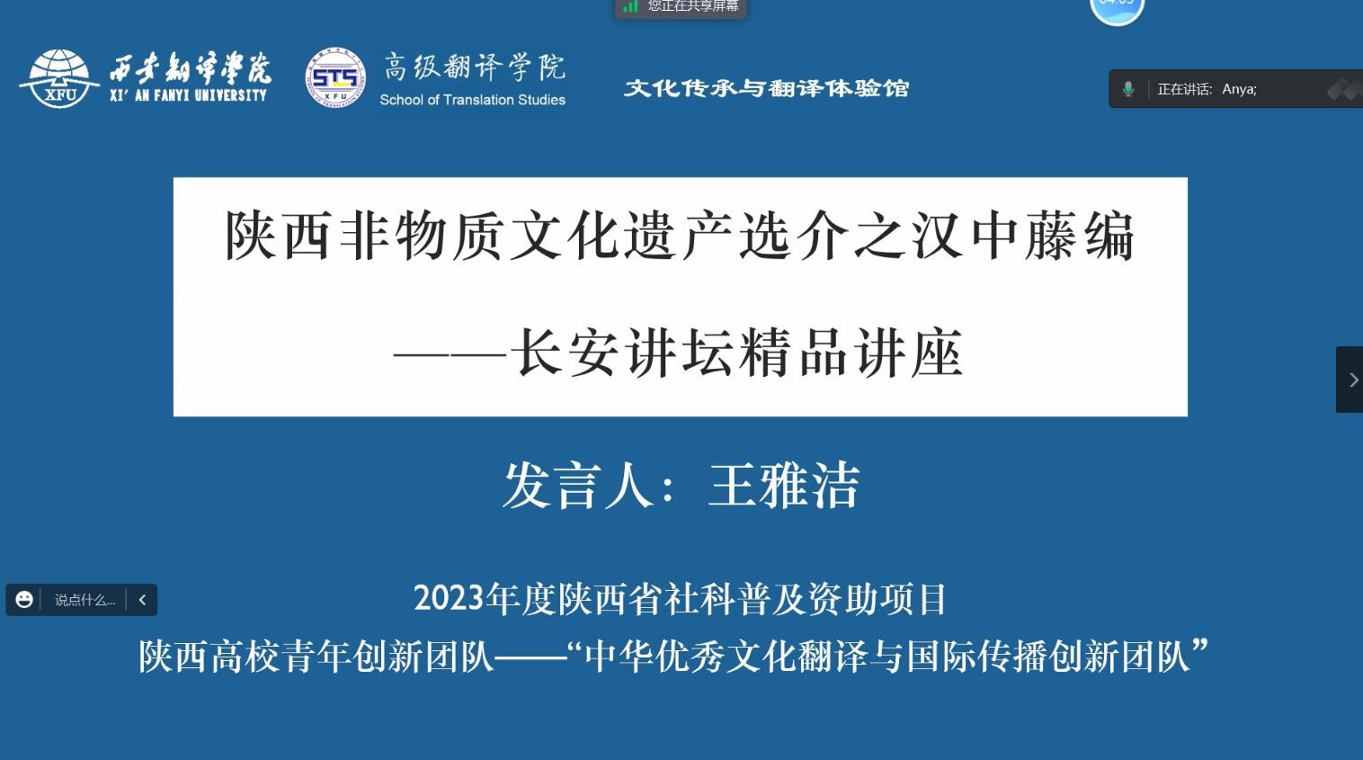 5月17日,sunbet申博文化传承与翻译体验馆科普基地在线上举办主题为“传承中华优秀传统文化——陕西地域文化”的科普讲座。此次讲座由高级翻译学院副教授王鹏主持,高级翻译学院专职教师王雅洁做题为“陕西非物质文化遗产选介之汉中藤编——长安讲坛精品”科普讲座。讲座准备充分,期间师生交流互动积极,效果良好。