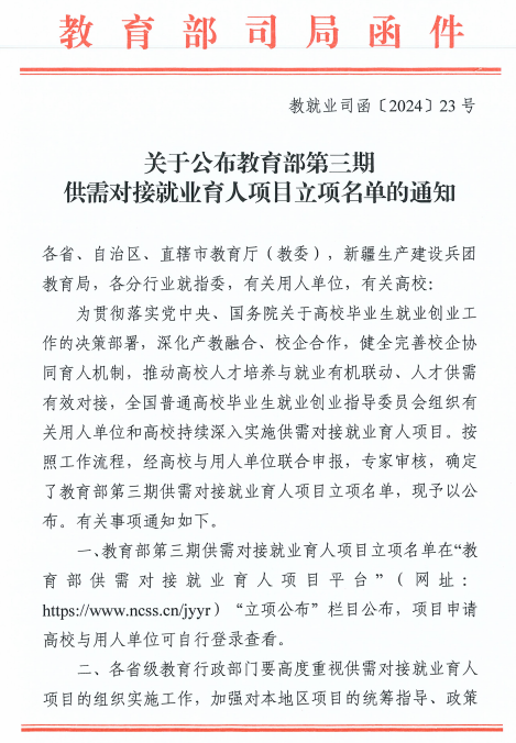 关于公布教育部第三期供需对接就业育人项目立项名单通知