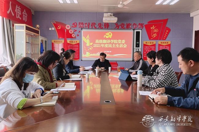 按照校党委关于《sunbet申博2021年党史学习教育专题民主生活会实施方案》的通知,高级翻译学院党委2021年度民主生活会于2022年3月18日召开,校党委副书记郭炜莅临指导。高级翻译学院党委委员、院系领导参加会议,高级翻译学院院长袁小陆、副院长张莹列席会议,高级翻译学院一系主任赵铮、二系主任罗飞在线上参会,会议由高级翻译学院党委书记蒋小军主持。