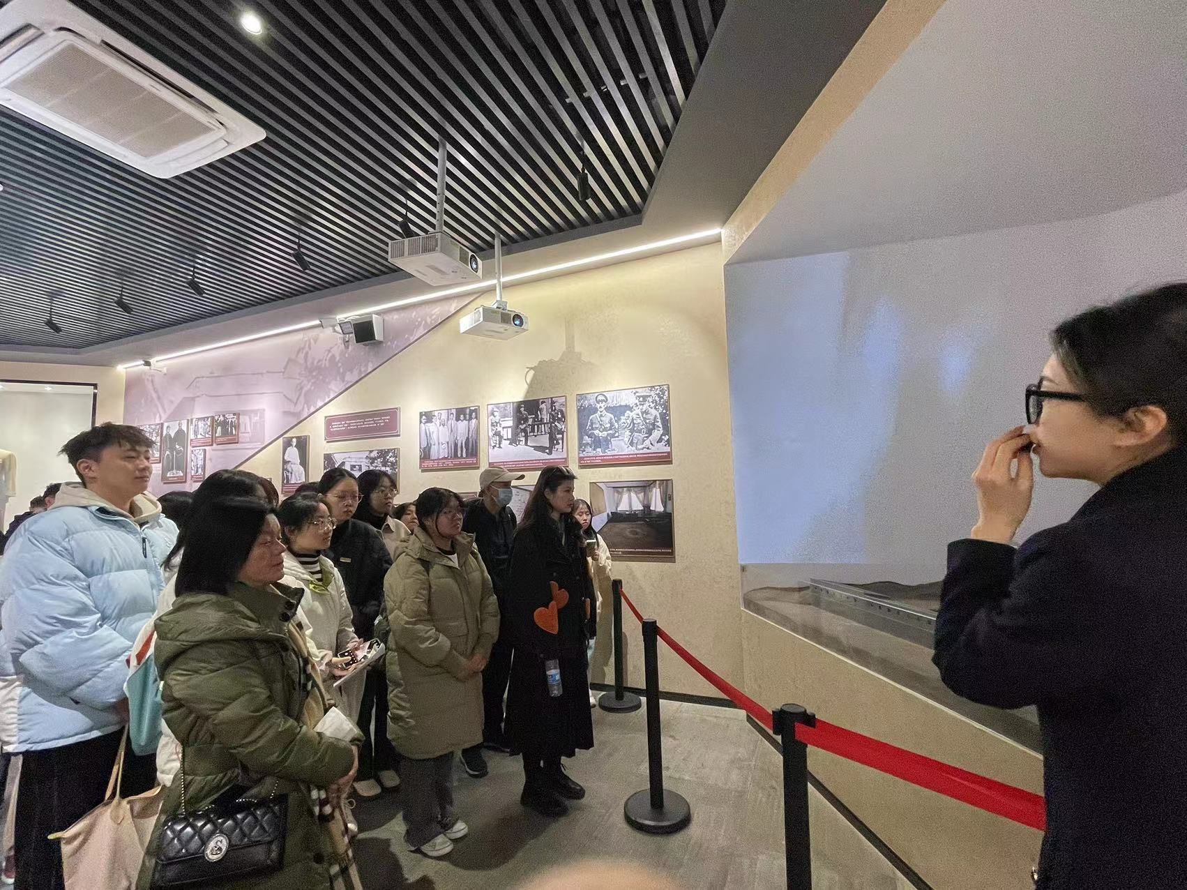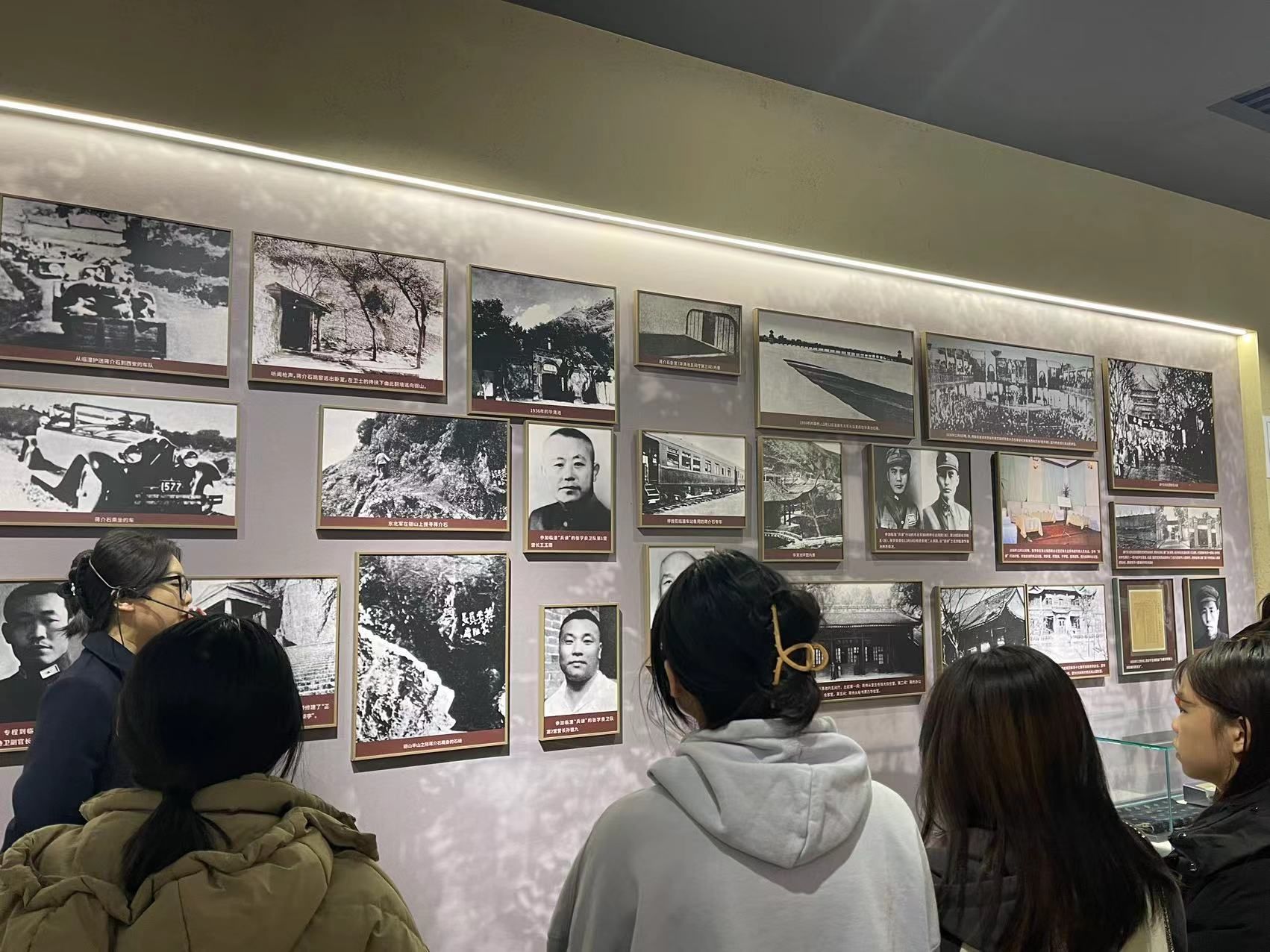在讲解员的带领下,同学们首先进入西安事变史实陈列馆的一号展厅。一号展厅分为民族危机、停止内战两个主题,展示了西安事变发生的背景。从日本关东军发动九一八事变后,中国东北三省全部被日军占领,并利用前清废皇帝溥仪在东北建立满洲国傀儡政权,导致中国的民族危机进一步加深。中日民族矛盾逐渐成为中国社会主要矛盾,中国进入抗日战争的局部战争阶段。中国各地发起抗日游行,张学良和杨虎城两位将军同中国共产党“逼蒋抗日”。随后,同学们进入二号展厅。二号展厅陈列发动兵谏、历史转折两部分内容,展厅高度概括了西安事变的发生过程和历史意义,它奠定了全民族抗战的基础,成为由国内战争走向抗日民族战争的转折点,时局转换的枢纽。同学们瞻仰了珍贵的历史文物和馆内壁画,了解到两位将军的生平史迹和中国共产党矢志救国的决心,纷纷表示深感震撼。