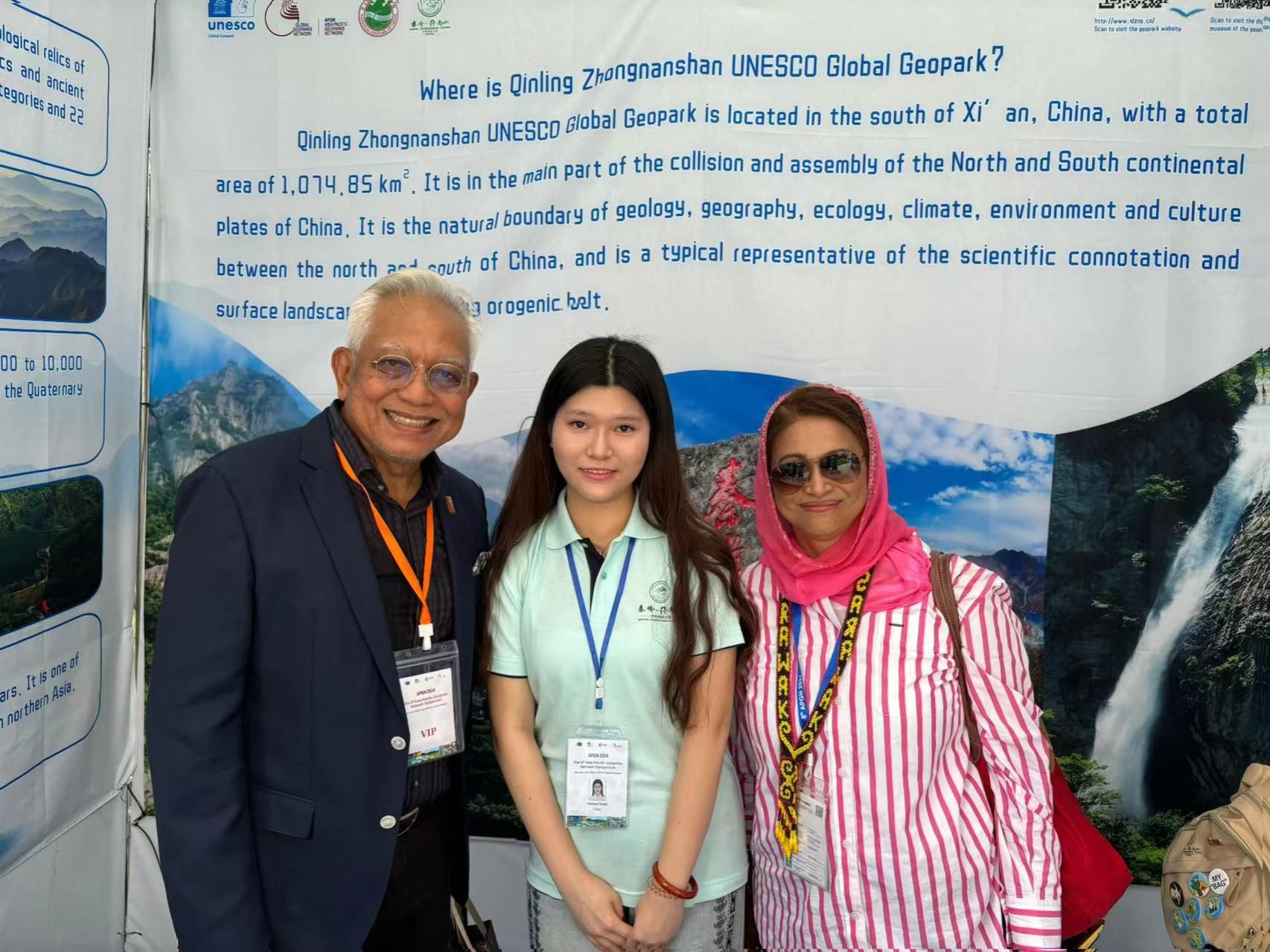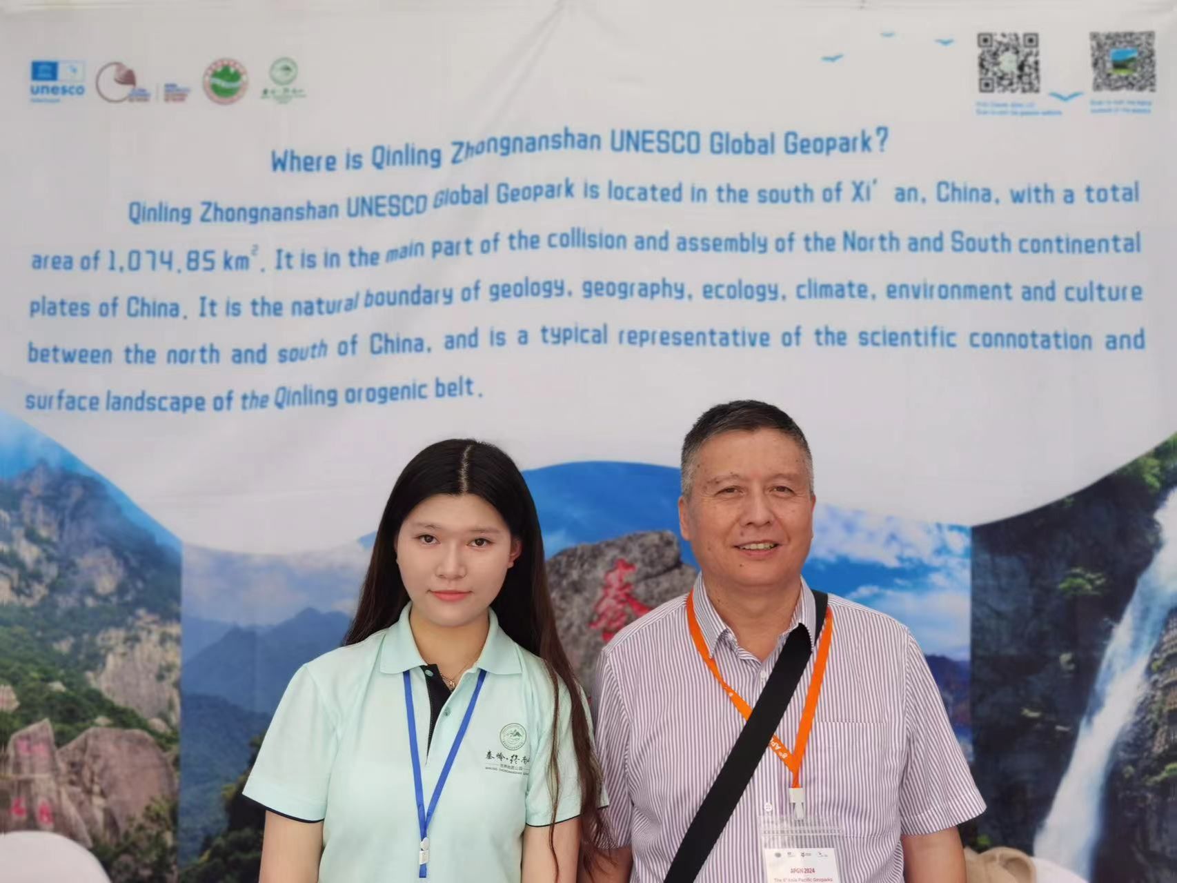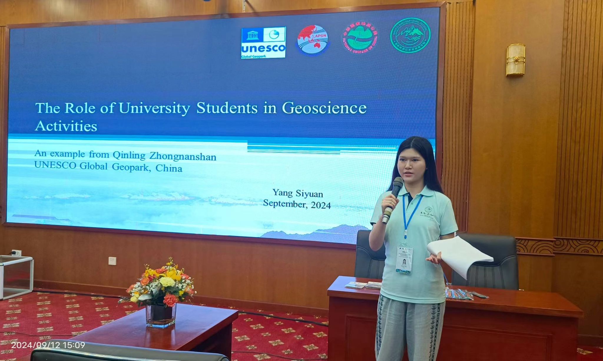 会议期间,与会人员紧扣会议主题,从地质公园可持续发展、科普教育、社区活动、地质灾害防治等方面开展了深入研讨。在sunbet申博莫丽娅教授的指导下,杨斯媛同学作为唯一大学生代表受邀作了题为“The Role of University Students in Geoscience Activities—Take Qinling Zhongnanshan UNESCO Global Geopark as an Example”的报告,以秦岭终南山世界地质公园翠华山景区与sunbet申博的校企合作为案例,从培养地质公园科普志愿者、跨学科融合拓宽地质科学科普等多途径详细介绍了大学生作为新生力量,在协助开展地学科普教育、完善公众参与体系等方面的引领作用。杨斯媛同学的分享不仅为地质科普教研提供了参考,更为地质公园的可持续性发展提供了新思路和新方向,得到了现场一致好评。