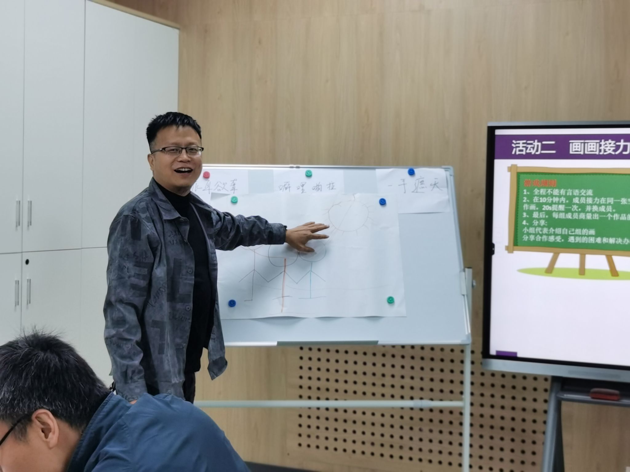最后进行的“画画接力赛”游戏,更是将活动推向了高潮。每个小组的成员都轮流在纸上画上一幅画,最终共同完成了一幅充满创意和想象力的作品。这一过程中,学工人员不仅体验到了团队合作的乐趣,更深刻理解了沟通、协调和相互尊重在团队合作中的重要性。