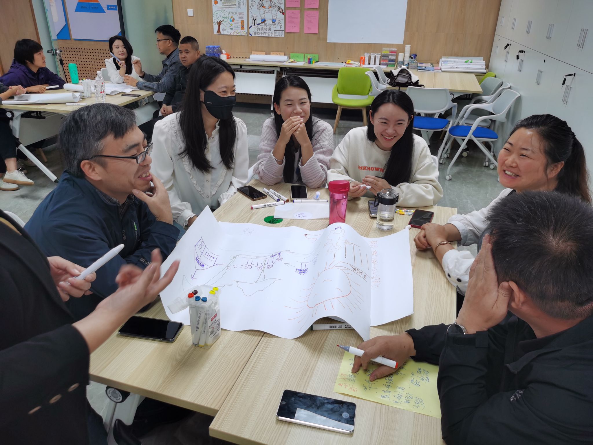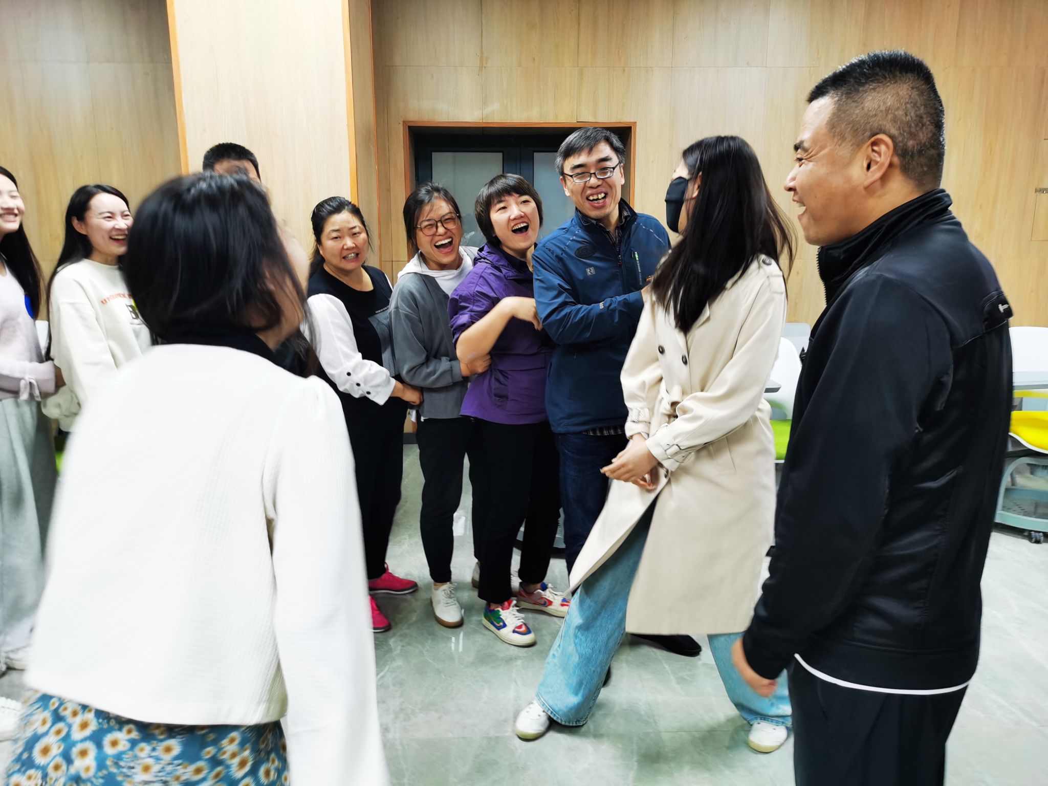 在理论学习之后,活动进入了紧张而有趣的团队游戏环节。首先进行的是“石头剪刀布”的游戏,两两分组,输的人要进入赢的人的队伍,看哪位老师能获得最终胜利。这一游戏不仅活跃了现场气氛,更让学工人员在轻松愉快的氛围中加深了彼此之间的了解和信任。随后,各个小组“用手画图案说意义”的游戏更是将团队合作和创新思维发挥到了极致。每个小组都充分发挥想象力和创造力,用手绘出了各具特色的图案,并生动诠释了图案背后的意义。这一环节不仅锻炼了学工人员的团队协作能力,更激发了大家的创新思维和表达能力。