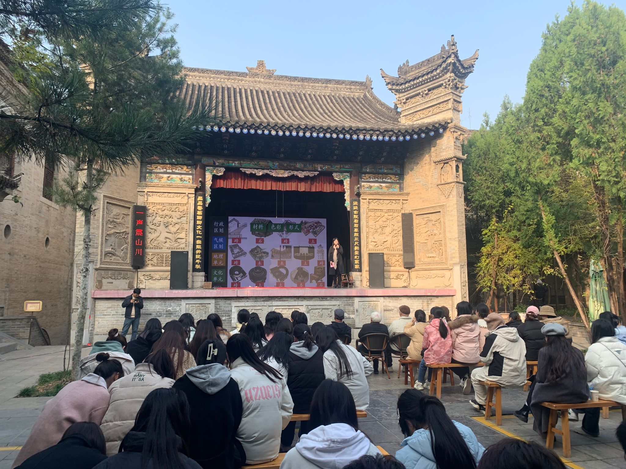 接着,同学们在梨园参加了西安市文物局、西安市文化和旅游局、西安建筑科技大学、关中民俗艺术博物院组织的“文物会说话系列大讲堂---民居物语”的讲座,由西安建筑科技大学博士生导师靳亦冰教授主讲。靳教授从文物与民居、诗词中的建筑、民居艺术建筑特征解读、非遗与民居四个方面展开了讲述。她介绍了我国传统民居类型及特点,如北京四合院的韵味十足,福建土楼的奇特造型,甘肃的下沉性窑洞和陕北窑洞的建筑特色,以及其与当地自然环境、人文历史的紧密联系。她讲述了民居中的建筑构件与装饰艺术,分析其制作工艺、艺术风格及所蕴含的文化寓意,展现古人的审美情趣和精湛技艺。靳教授还分析了民居建筑所见证的历史事件、家族变迁等,体现民居在传承历史文化方面的重要价值。