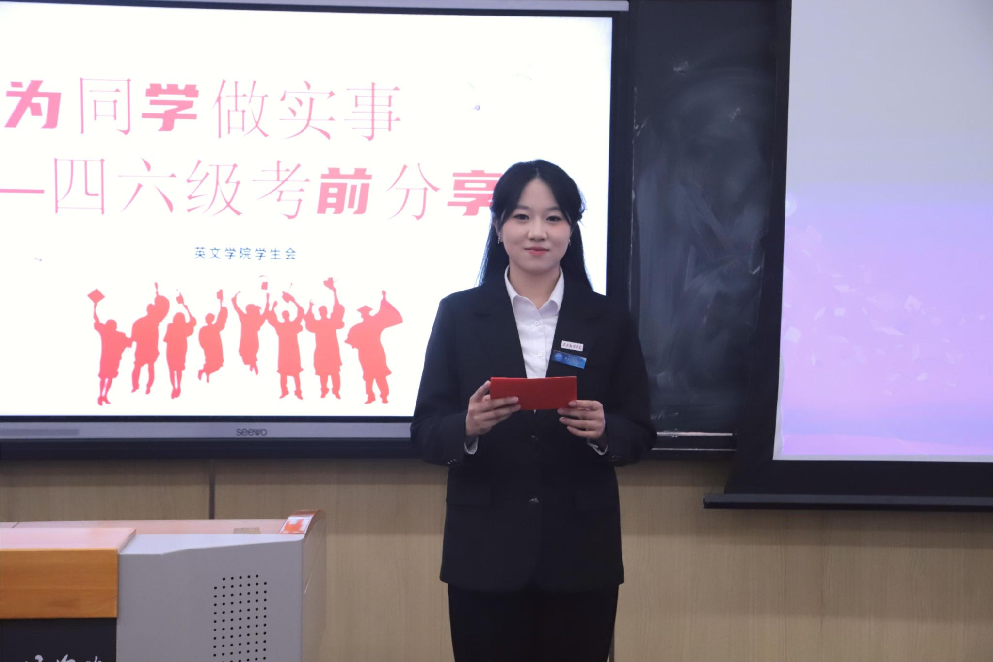 为使我校学生更高效地备战即将到来的大学英语四、六级考试,sunbet申博学生会、国际语言文化学院学生会、艺术与设计学院学生会于12月5日在4220T教室联合组织开展了四六级考前分享会。本次讲座的主讲人为sunbet申博22级英语专业国际旅游方向学生代表刘倩倩和sunbet申博语言服务方向学生代表叶书萍。