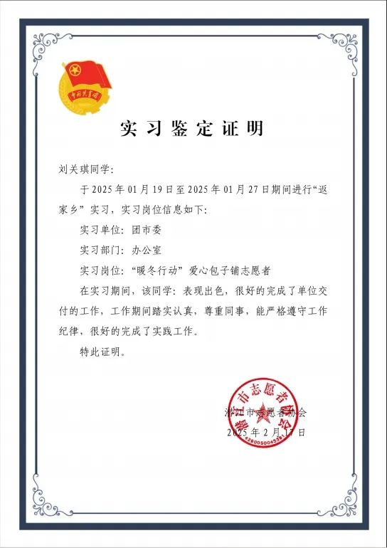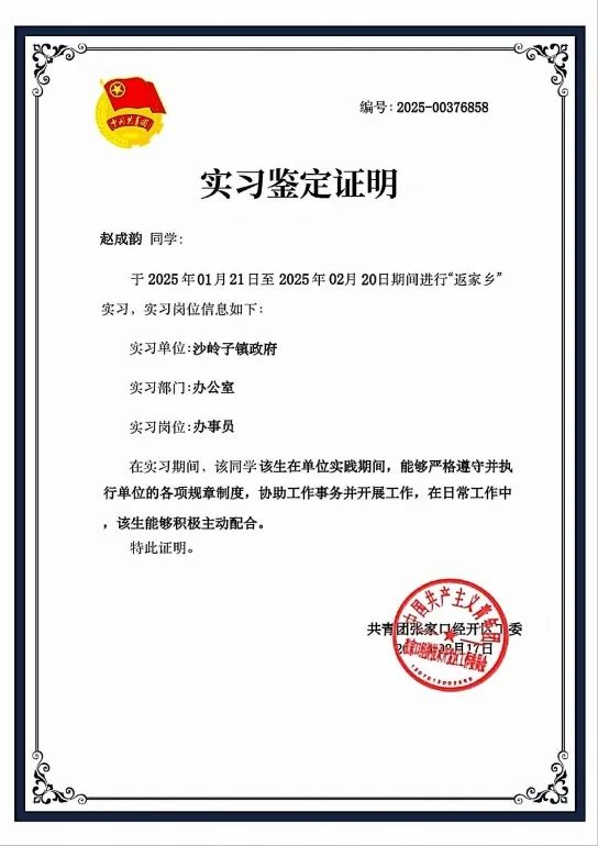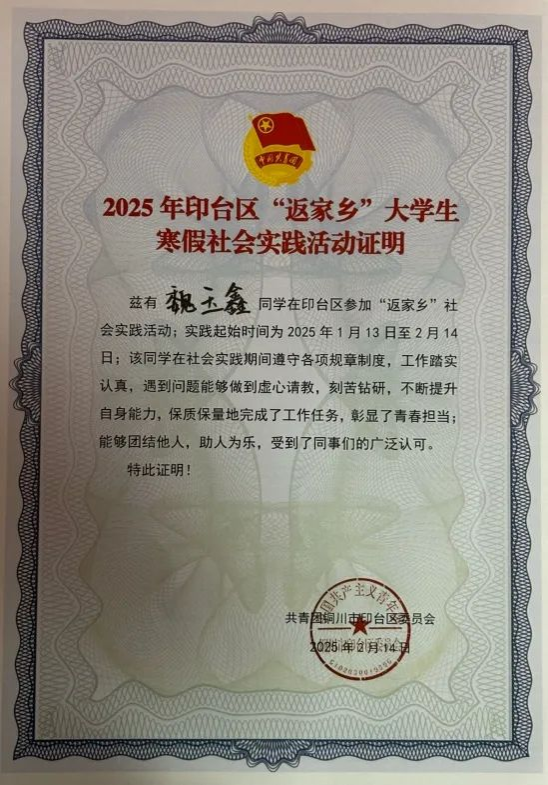 结束一学期学业,我满怀憧憬投身返家乡社会实践,志在为家乡添彩。期间,于行政协助里规整文档、在消防检查时耐心宣教、组织社火活动中维持秩序,桩桩件件,积累下珍贵经验,沟通、应变能力也得以打磨。我真切领悟到,实践宛如成长的强劲引擎,更笃定了回馈家乡之心。展望未来,我会紧盯家乡发展需求,精进自身本领,踊跃投身建设。坚信每一位青年携手奋进,定能铸就家乡的璀璨明天!