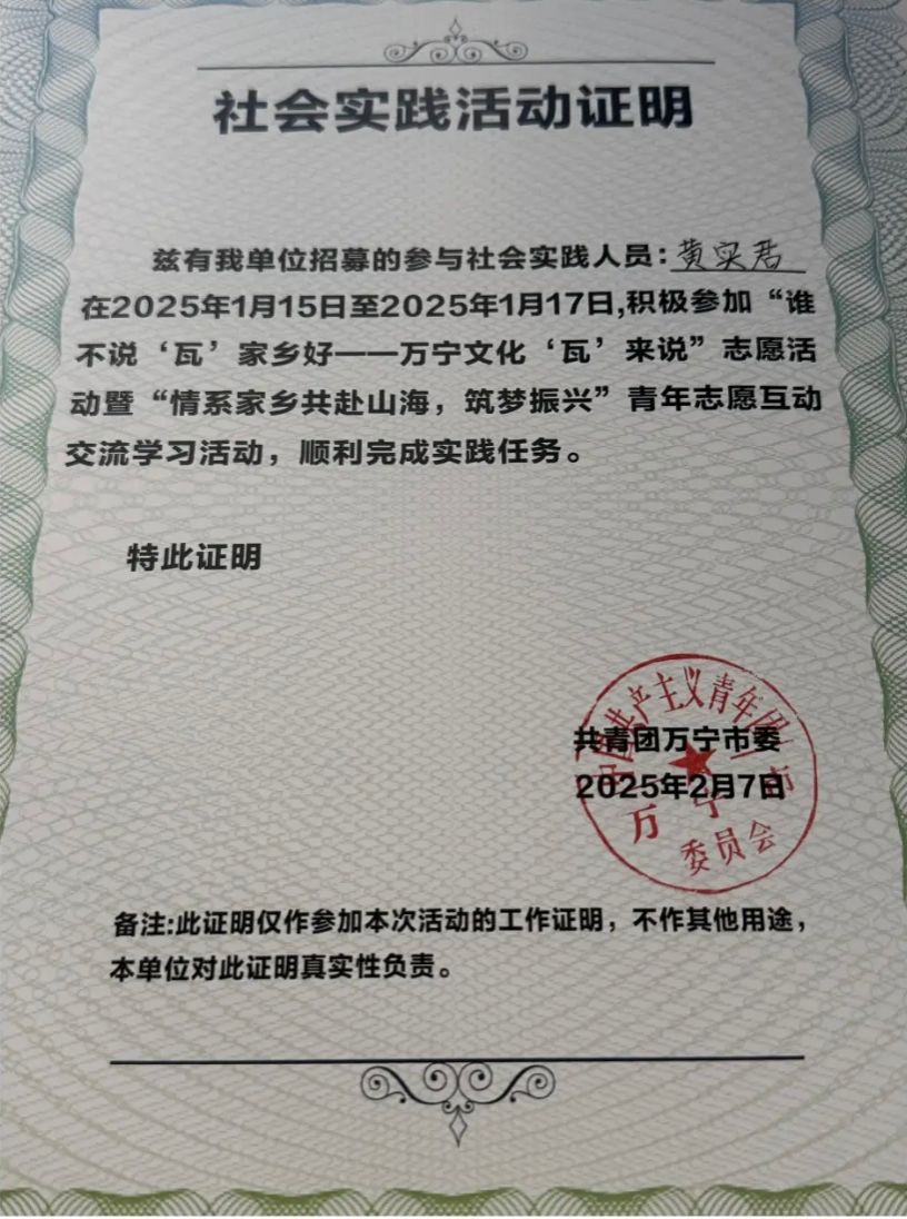 “无论走得多远,家乡永远是我们心中的根。” 本寒假,我参加了万宁市团委举办的“谁不说‘瓦’家乡好 —— 万宁文化‘瓦’来说” 志愿活动 ,活动中,我们积极走访文化地标,深入了解了各具特色的独特遗产,并在活动中积极向游客宣传当地文化,让更多人了解这座美丽而有内涵的城市。本次志愿活动让我从“文化享用者”成长为了“文化传播者”,接过先辈智慧,肩负传承使命。同时,作为新时代青年,我更应用创意为古老文化添彩,让其焕发新活力。在万宁,“瓦”不只是一句乡音,更是刻在心底、值得世代守护的精神图腾。
