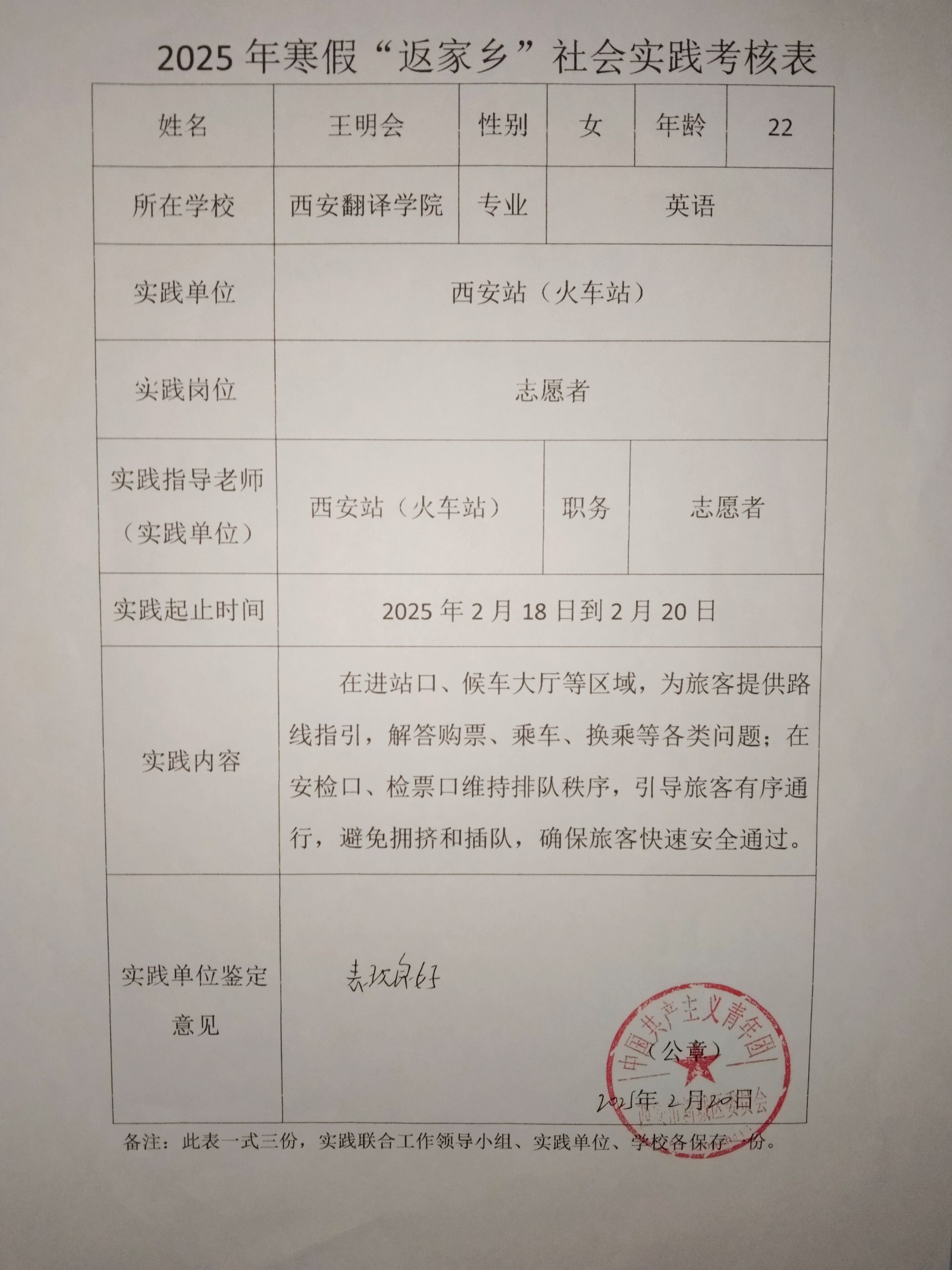 在志愿服务中,我真切体会到春运的忙碌与人们对团圆的渴望。看到旅客们在我的帮助下顺利踏上归乡旅途,那份满足感难以言表。这不仅提升了我的沟通与应变能力,更让我懂得了奉献的价值。未来,我希望能参与更多志愿服务,用实际行动传递温暖与善意。