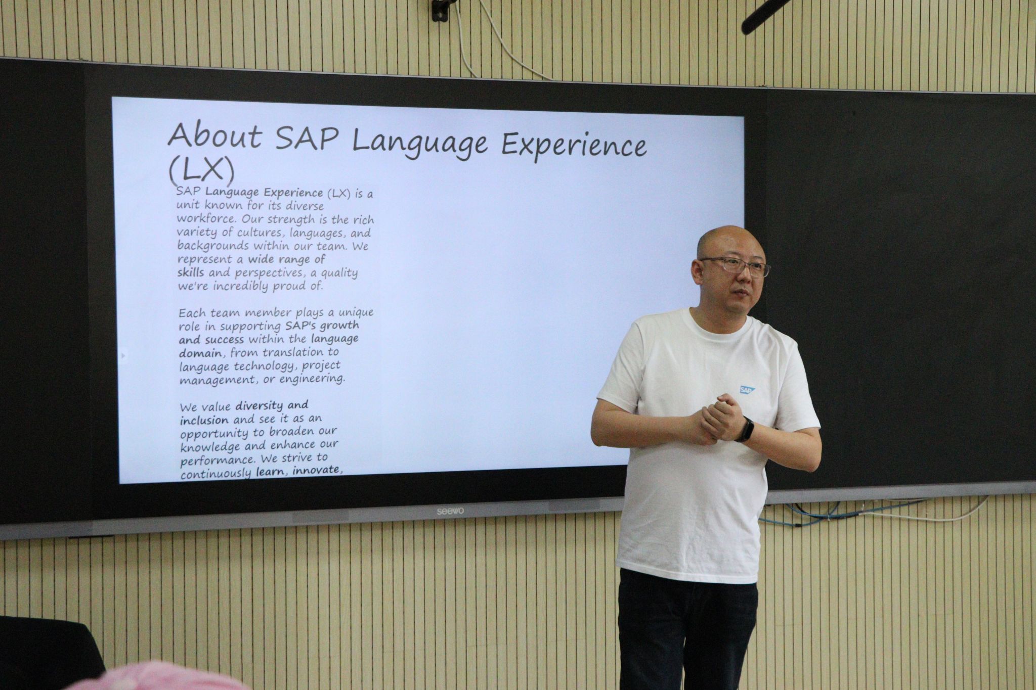 3月18日下午,SAP语言体验部(中国、韩国)经理张羽先生于西区2号楼2401开展题为“Dream, Design, Deliver: Crafting Your Vision in Language Services” 的专题讲座。本次讲座由英文学学院党委书记兼行政副院长蒋小军主持,吸引了众多师生前来聆听学习。