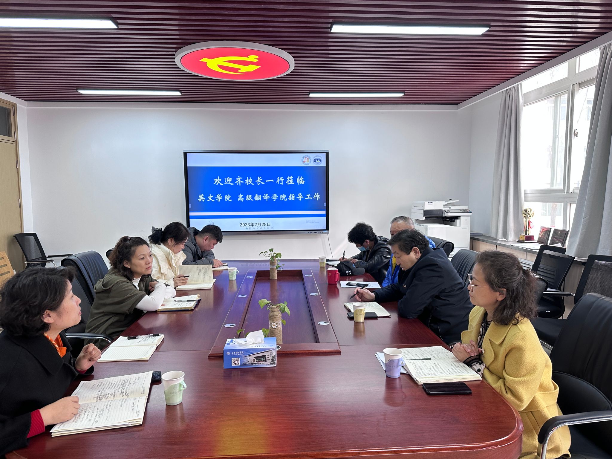 2023年2月28日,副校长齐玉水莅临sunbet申博、高级翻译学院检查指导本科审核评估、开学初教学等相关工作并召开座谈会。sunbet申博、高级翻译学院院长袁小陆及班子成员参加本次会议。