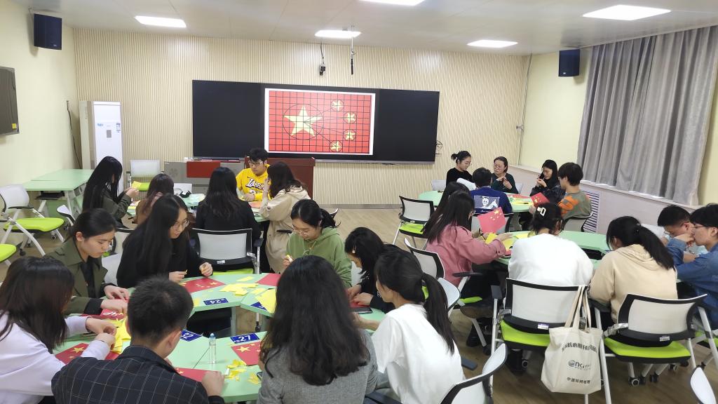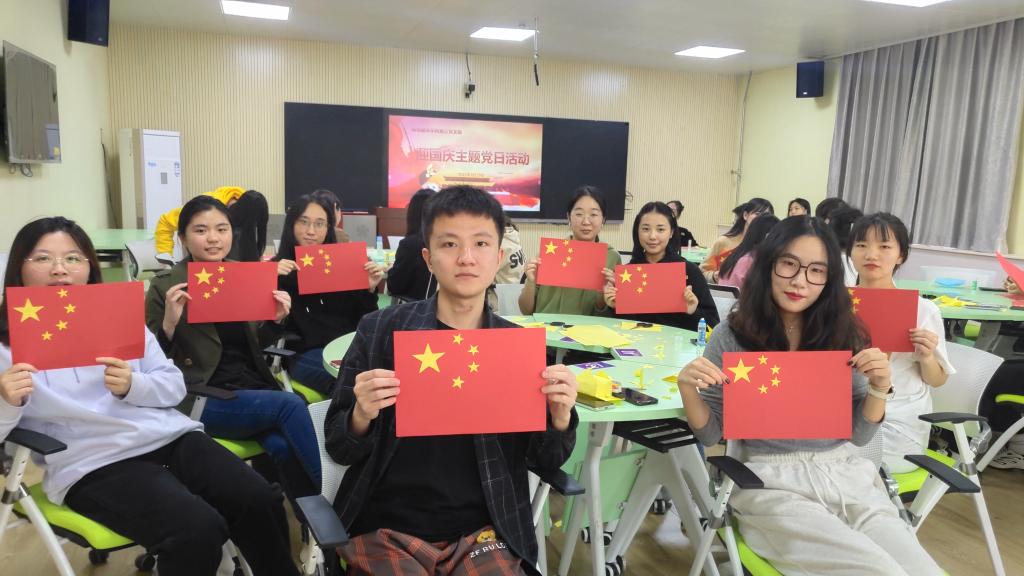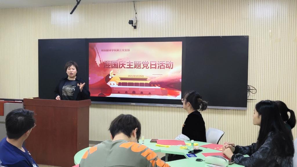 “五星红旗,你是我的骄傲,五星红旗我为你自豪”金秋送爽,丹桂飘香,我们迎来了一个收获的季节。 9月29日中午12:30在2407智慧教室,高级翻译学院第三党支部全体党员在支部书记陈晓楠的带领下开展“迎国庆“主题党日活动。