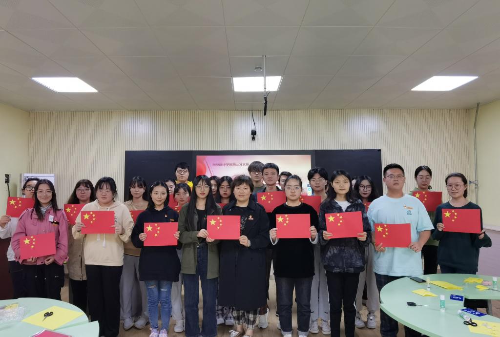 此次党日活动中,通过预备党员李松润讲党课《我国第一面五星红旗》,生动形象的为我们分别讲述了中国国旗的由来、设计及其象征意义,让每位党员更深入的了解我国国旗的发展及其重要意义,并了解了《国旗法》的内容。接着,在活动第二项观看影片《红岩》节选中“江姐绣红旗”的片段,本环节由学生党员朱珂星带领大家观看,她给大家讲述了这面特殊的五星红旗背后的真实故事。革命志士把对中国共产党、对新中国坚贞的爱“绣”进了红旗中,电影的原型就是小说的主人公罗广斌,如今,这面特殊的五星红旗收藏于国家博物馆。随后在,学生党员手工制作国旗环节中,由学生党员韩星语、庄冰冰首先给大家讲解制作国旗的标准,四颗小星星和大星星的位置摆放要求,并指导大家现场制作国旗。最后,第三党支部全体党员一同为祖国母亲72岁华诞献上了诚挚的祝福:“祝祖国母亲生日快乐,请党放心,强国有我!”
