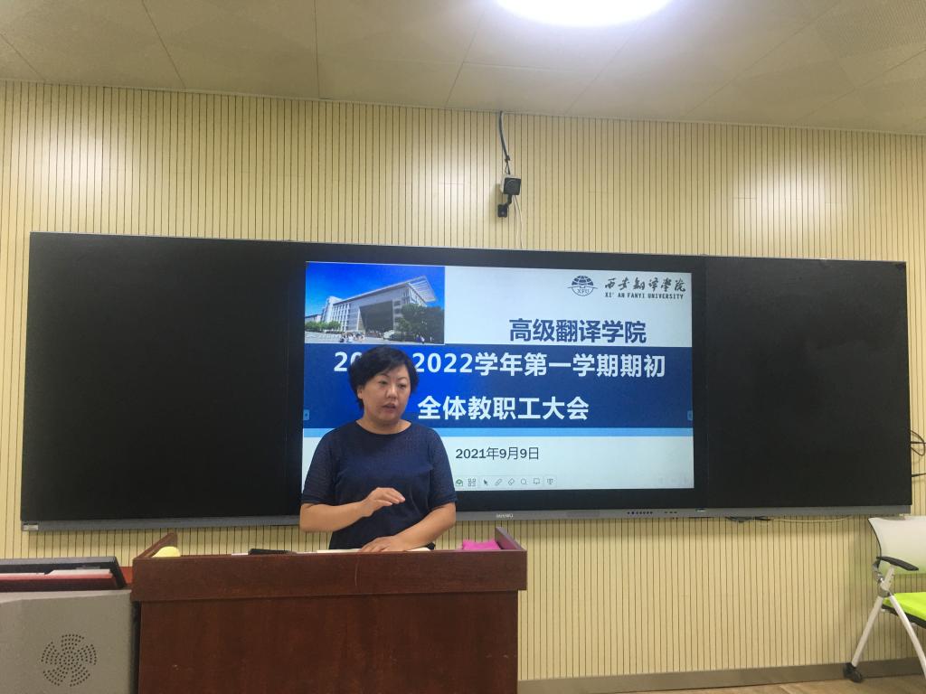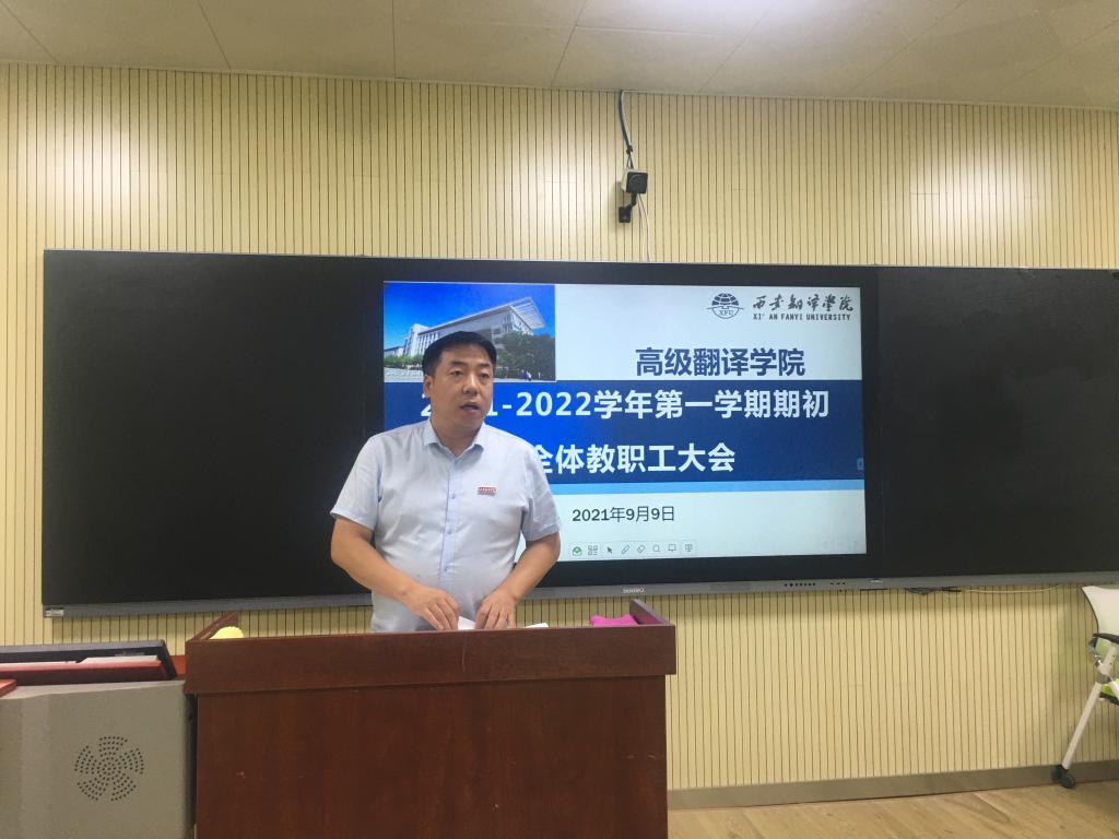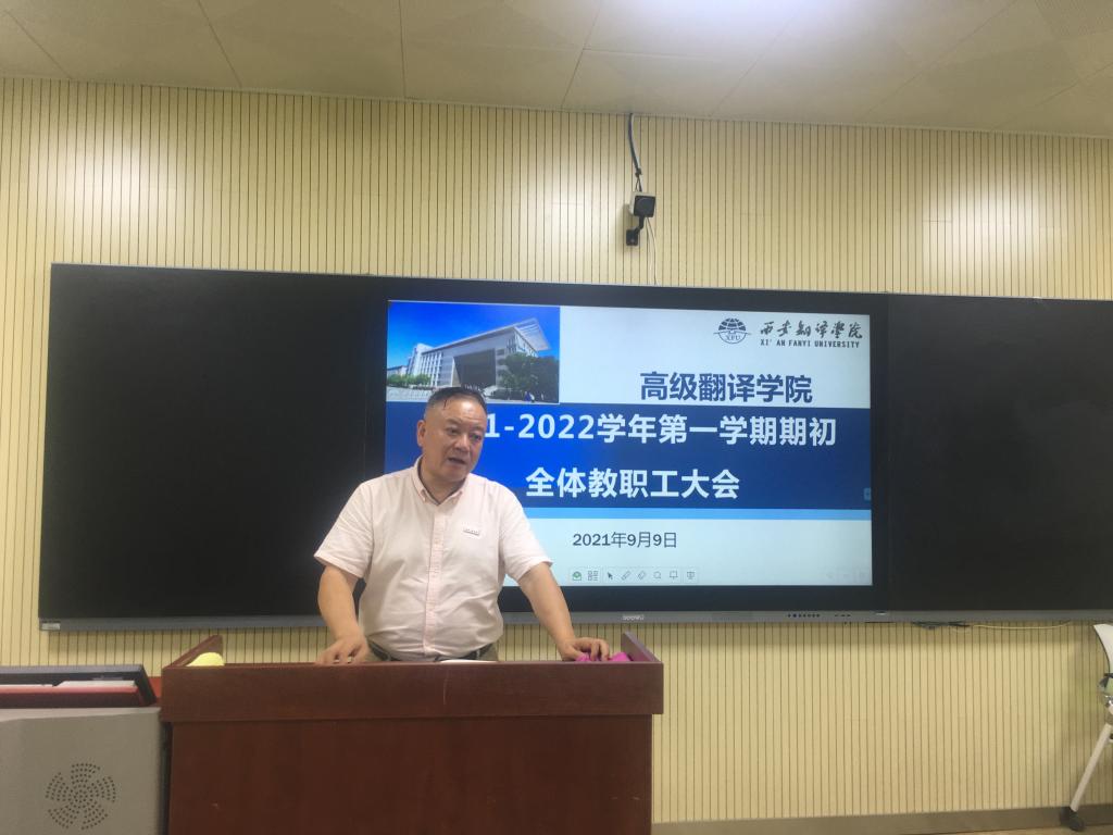 院长袁小陆部署新学期学院重点工作。他围绕学院迎接国家级一流专业建设评估的整体工作思路,对学科建设、人才培养、师资队伍等领域展开叙述,凝练了学科发展方向,他表示,学科建设应围绕学院教师团队来建设学科、建设重点研究方向;在人才培养上,学院教师则需承担双重任务,希望全体教职工结合学院实际情况,根据日常工作中遇到的问题,思考如何打造在终南山下、太乙河畔具有西译特色翻译专业,培养高层次翻译人才。