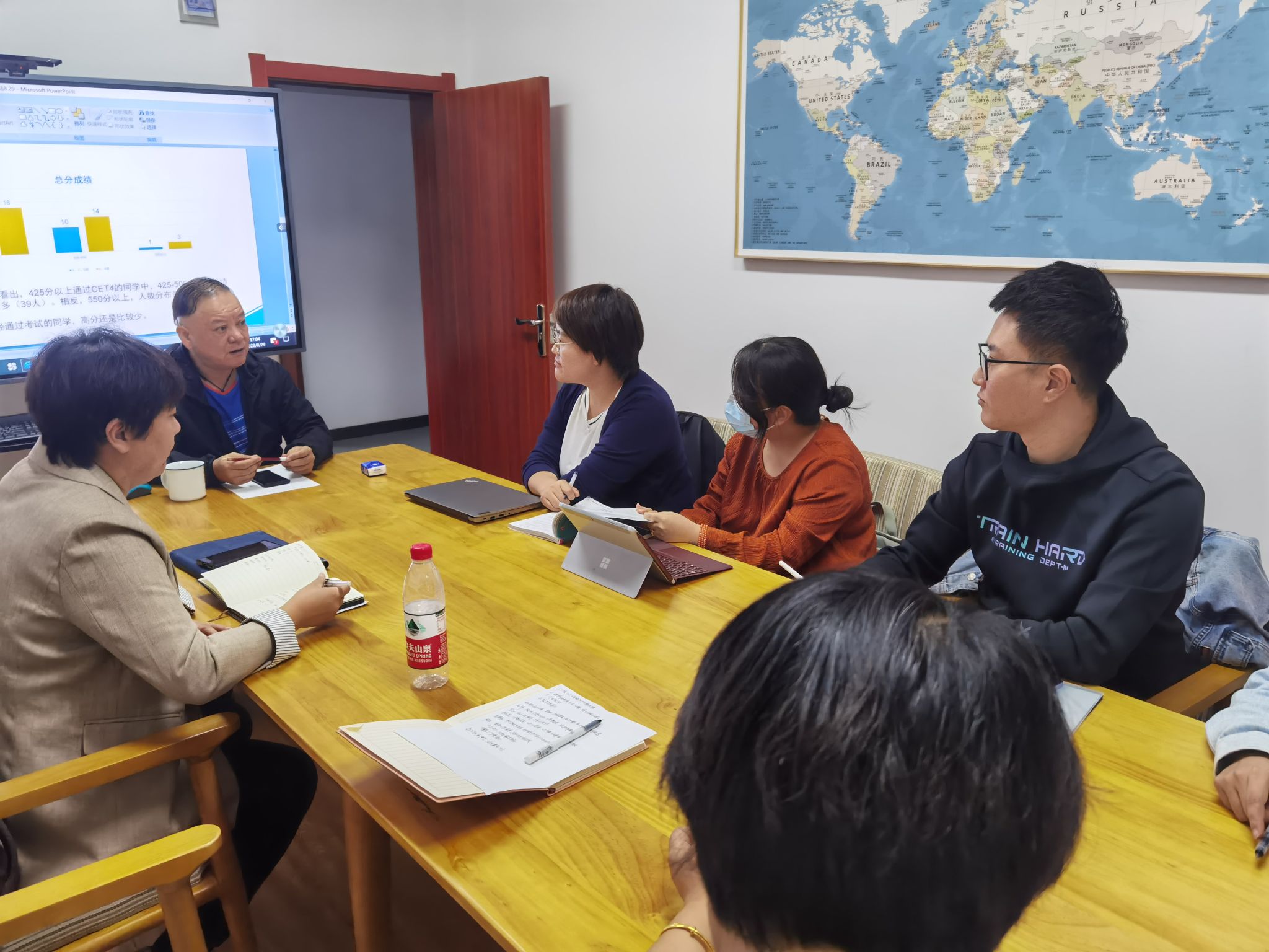 8月29日下午,高级翻译学院召开2021级卓越班CET4成绩分析及综合英语教学研讨会,出席本次会议的有院长袁小陆,副院长张睿及部分老师。