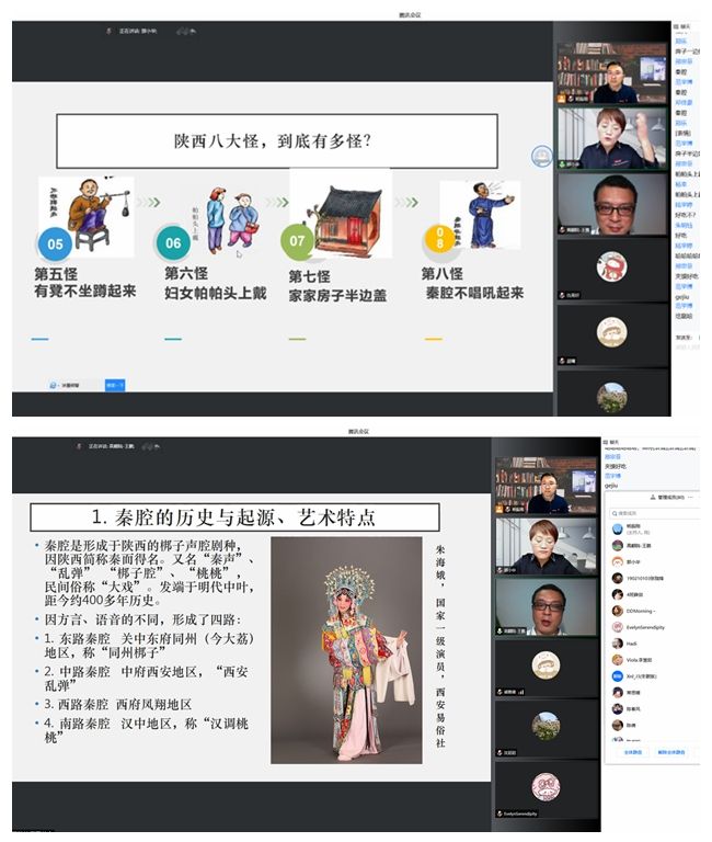 此次讲座由高级翻译学院副教授杨振刚主持,高级翻译学院副教授郭小华、王鹏分别做题为“陕西八大怪——关中民俗文化的底蕴与传承”“源于陕西的文化传承,走向世界的秦腔艺术”科普讲座。讲座准备充分,期间交流互动积极,效果良好。