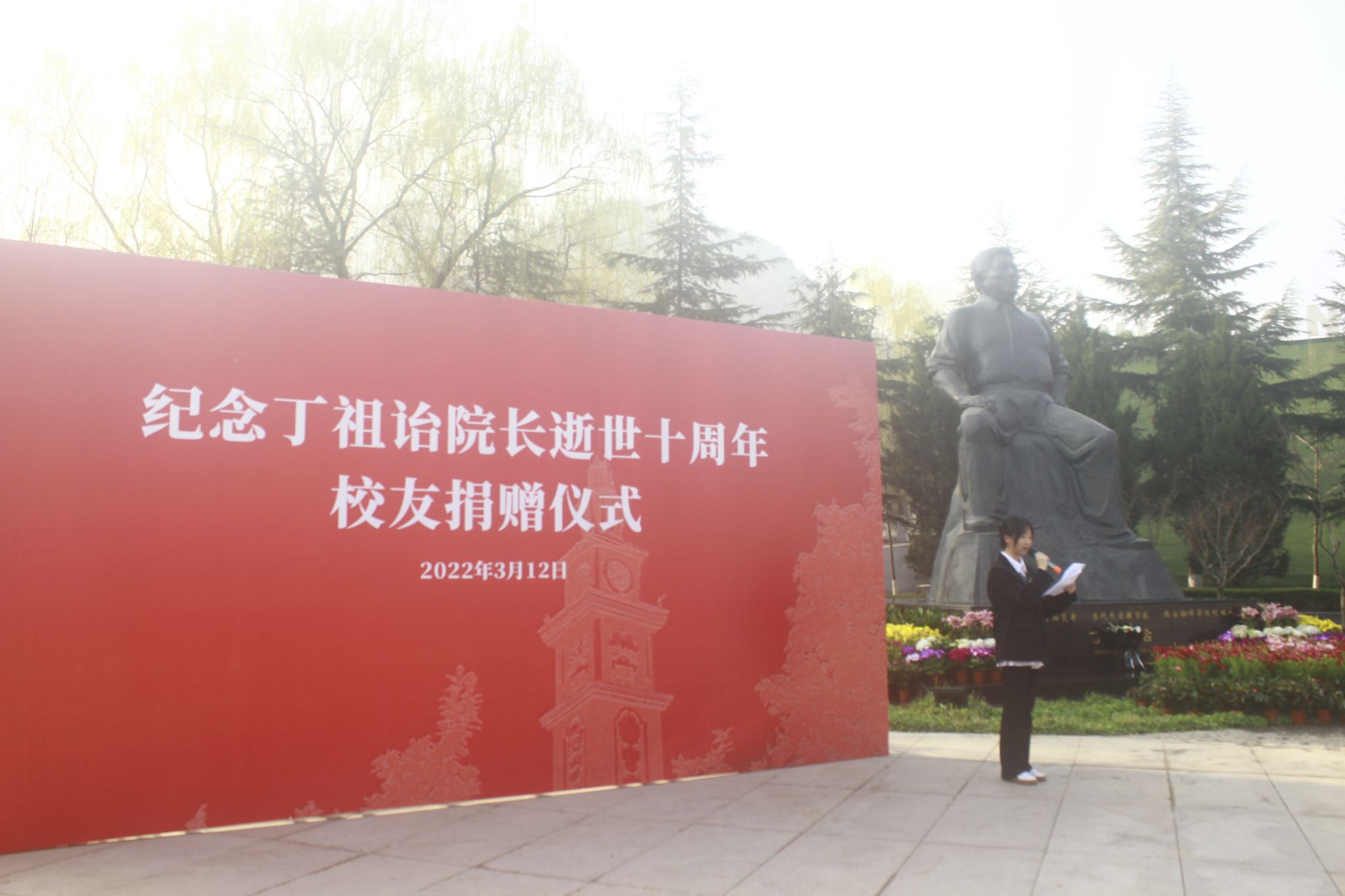 2022年3月11日早9点整,高级翻译学院师生代表在学校八号楼诒华广场举行纪念追思活动,在丁祖诒老院长的铜像前,深切缅怀老院长,表达怀念、追思与景仰之情。高级翻译学院院长袁小陆,行政副院长蒋小军,教学副院长张睿,科研副院长张莹,综合办主任简实,部分教师代表及学生社团干部代表参与此次活动,大一学生李家豪担任主持。