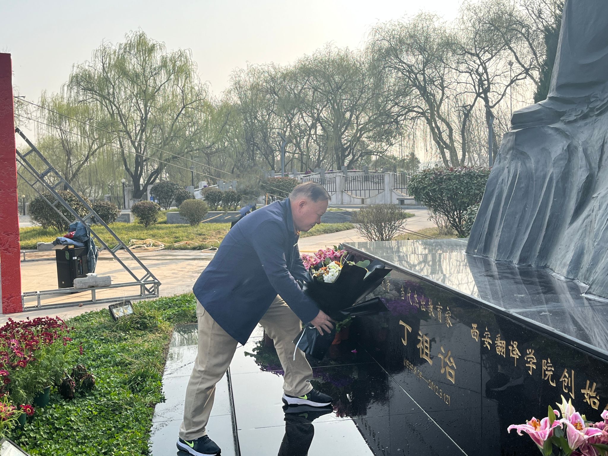 高级翻译学院院长袁小陆向丁祖诒老院长敬献花束,并带领大家向丁祖诒院长塑像三鞠躬致以崇高的敬意和深切的悼念。