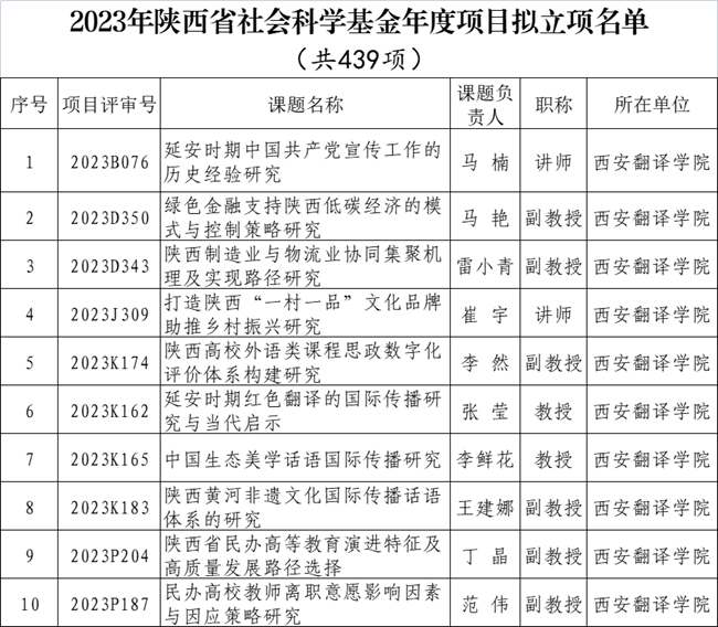 近日,陕西省哲学社会科学工作办公室近日公布了2023年陕西省社会科学基金年度项目(以下简称“省社科基金”)立项名单。全省共立项439项,我校获批10项。本次获批项目数量是继2022年之后又一次突破,属同类院校中立项数量最多的高校。我院副院长张莹的“延安时期红色翻译的国际传播研究与当代启示”课题获立项。
