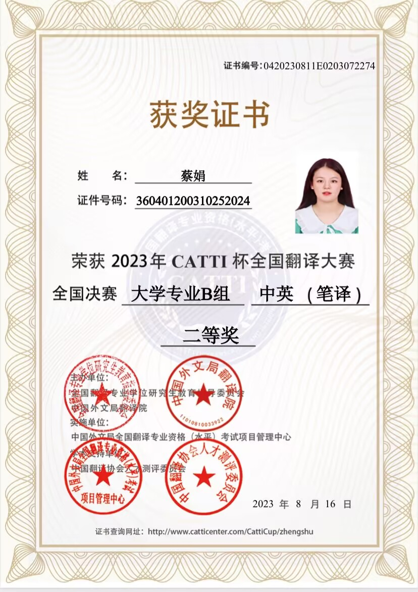 7月29-30日,2023年“CATTI杯”全国翻译大赛决赛在全国顺利举行。8月16日,决赛成绩公布,我校高级翻译学院学生蔡娟荣获全国二等奖,张予潇、王怡范紫怡、杨蕊萌荣获全国三等奖,指导教师罗彤、王鹏、徐丽丽、马慧荣获优秀指导教师奖