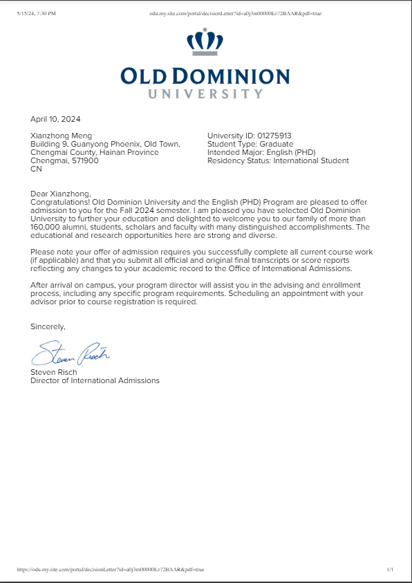 我院2020届学生孟献忠成功申请美国欧道明大学(Old Dominion University)语言学专业博士,并获得全额奖学金。孟献忠同学于2016年入学sunbet申博,攻读翻译专业本科学位。2021年,他前往马西亚大学继续深造,并于2023年顺利获得英语研究专业硕士学位。孟同学对学术的不懈追求促使他不断超越自我,最终在今年独立成功申请到了美国博士,预计于今年8月入学。