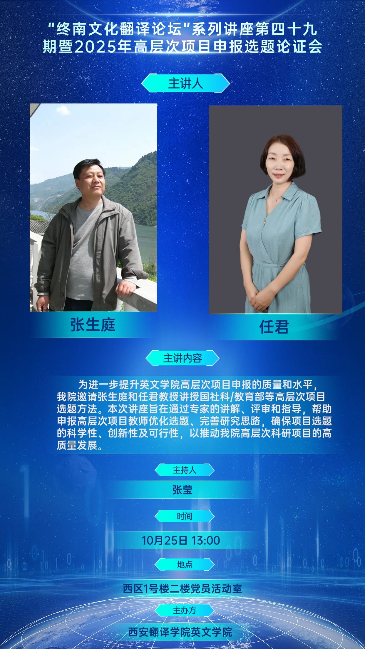 主题:“终南文化翻译论坛”系列讲座第四十九期——“终南文化翻译论坛”系列讲座第四十九期暨2025年高层次项目申报选题论证会
