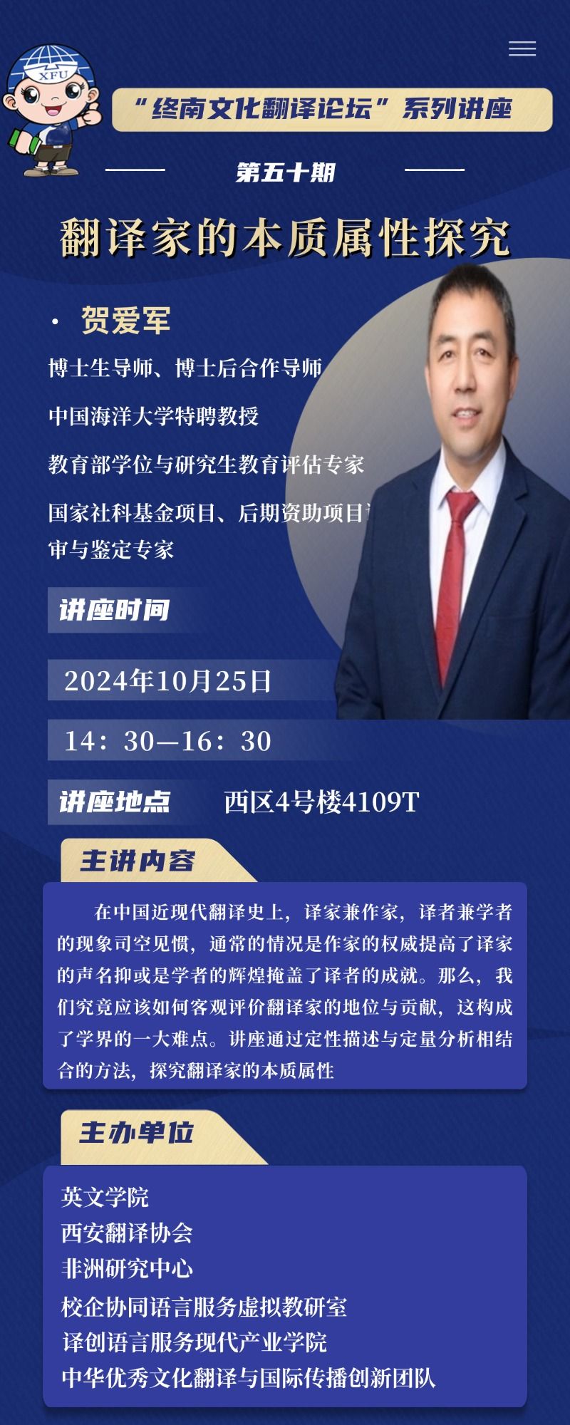 主题:“终南文化翻译论坛”系列讲座第五十期——翻译家的本质属性探究