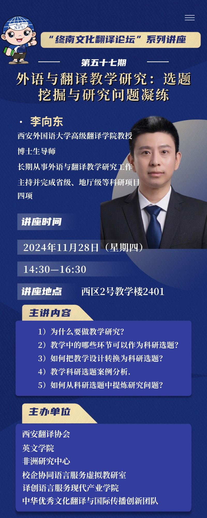 主题:“终南文化翻译论坛”系列讲座第五十七期——外语与翻译教学研究:选题挖掘与研究问题凝练