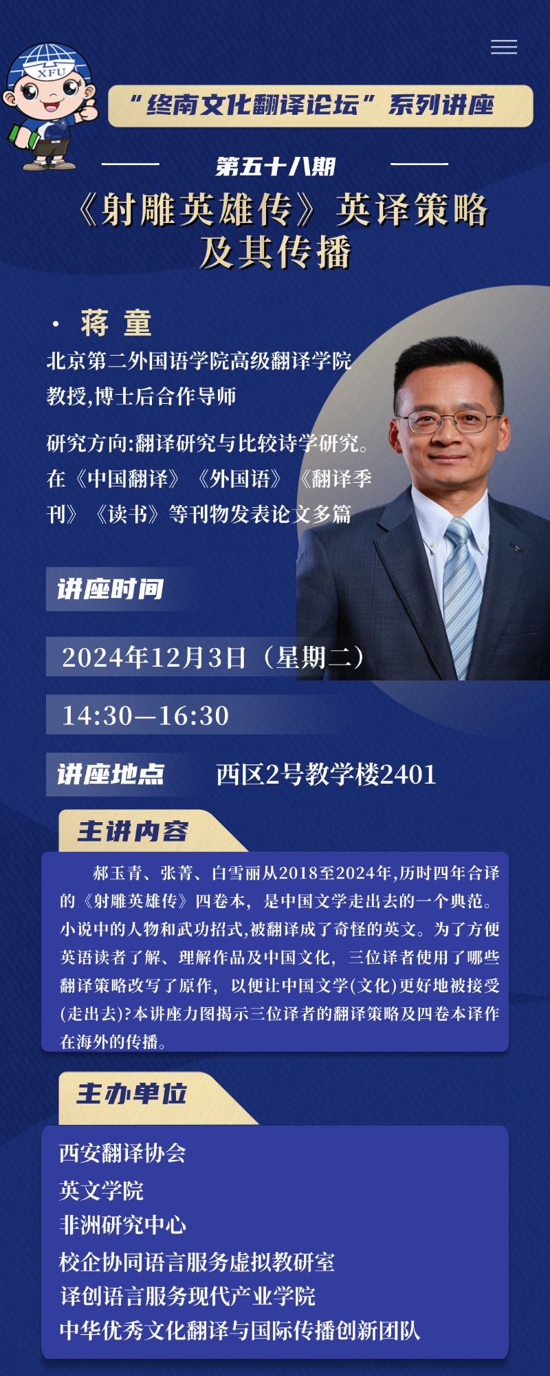 主题:“终南文化翻译论坛”系列讲座第五十八期——《射雕英雄传》英译策略及其传播