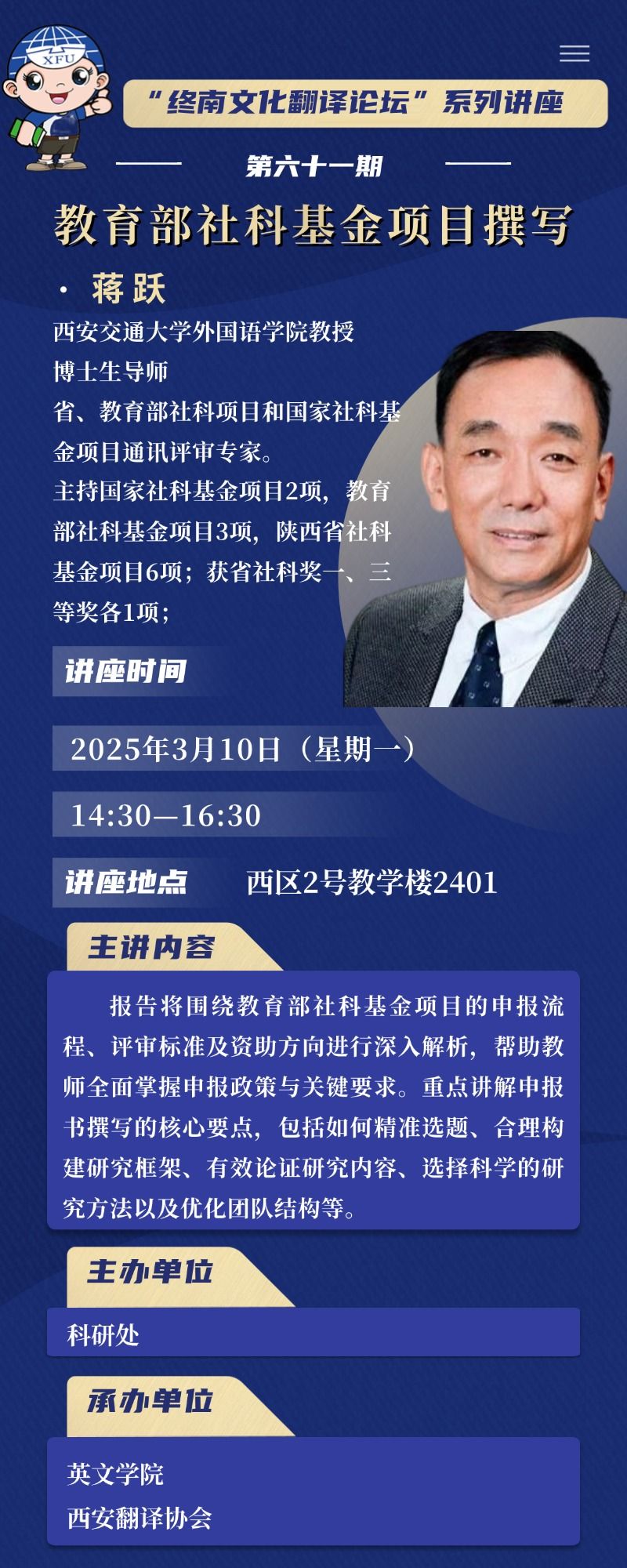 主题:“终南文化翻译论坛”系列讲座第六十一期——教育部社科基金项目撰写