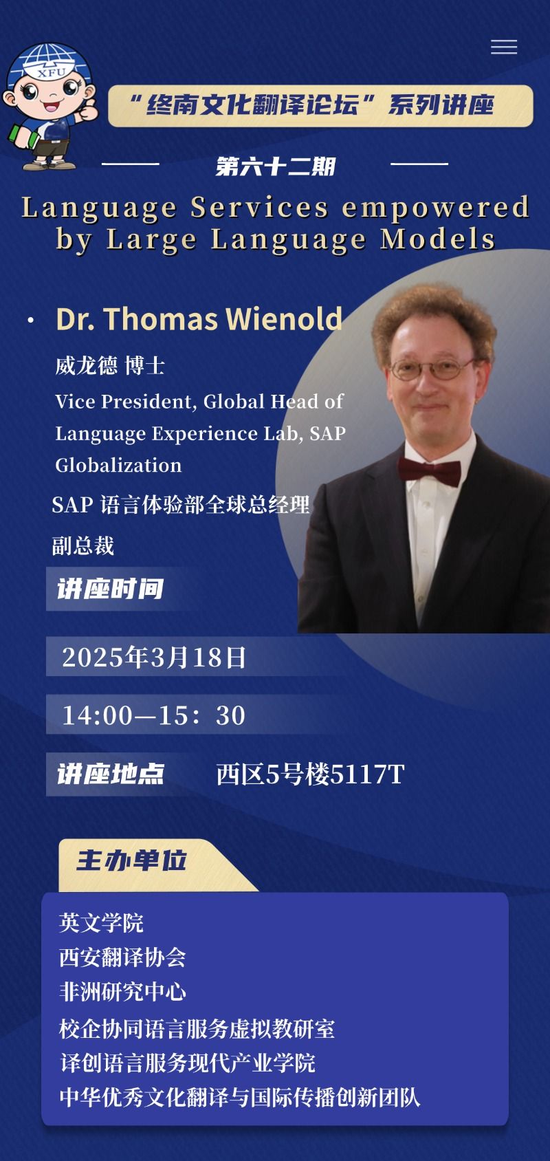 主题:“终南文化翻译论坛”系列讲座第六十二期——Language Services empowered by Large Language Models