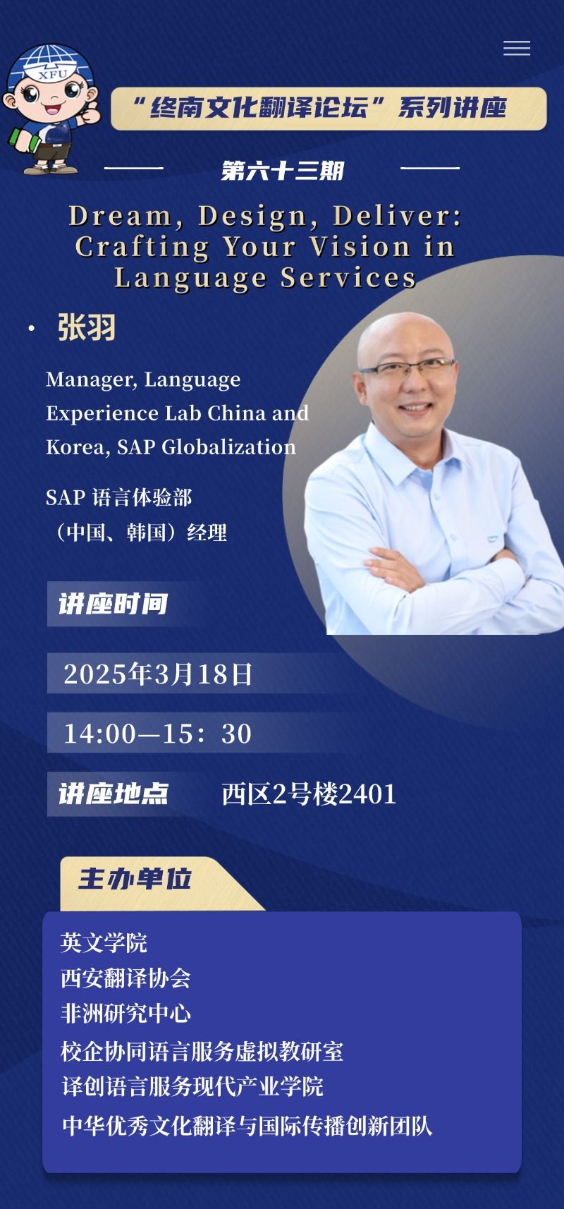 主题:“终南文化翻译论坛”系列讲座第六十三期——Dream, Design, Deliver: Crafting Your Vision in Language Services