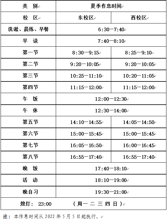 5月5日起,全校进入夏季作息时间(见附件),请各单位、各部门及时做好相应教学和工作安排。