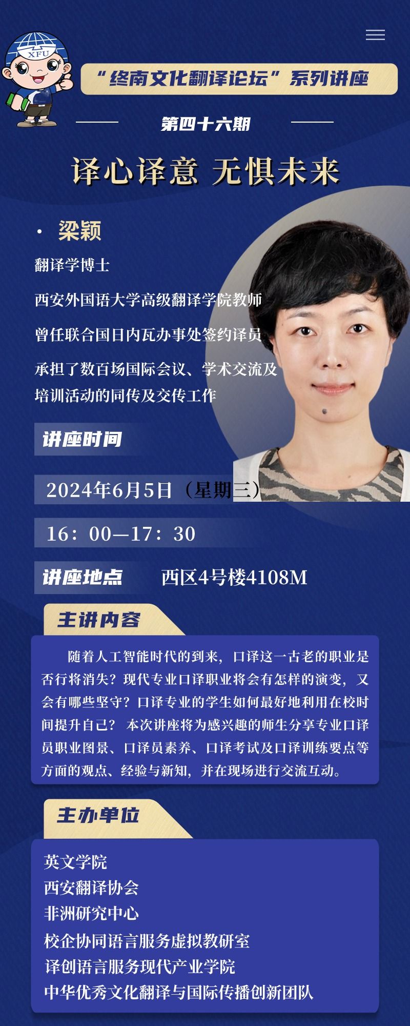 主题:“终南文化翻译论坛”系列讲座第四十六期——译心译意 无惧未来