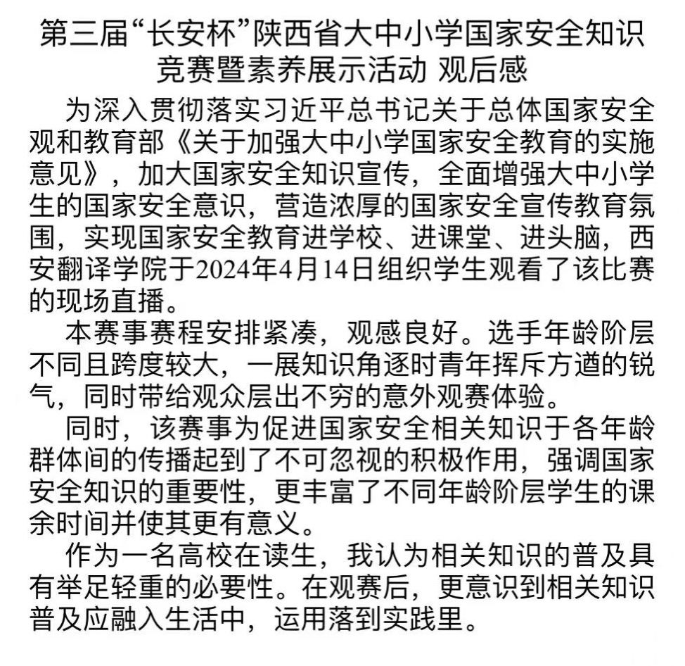 2024年4月15日为第九个全民国家安全教育日,为深入贯彻落实党的二十大报告中“增强全民国家安全意识和素养,筑牢国家安全人民防线”的精神,围绕“总体国家安全观·创新引领10周年”活动,sunbet申博通过主题班会、集中观看、撰写观后感等形式组织同学们观看国家安全宣传教育片,增强每位同学切实承担起维护国家安全的责任与使命!