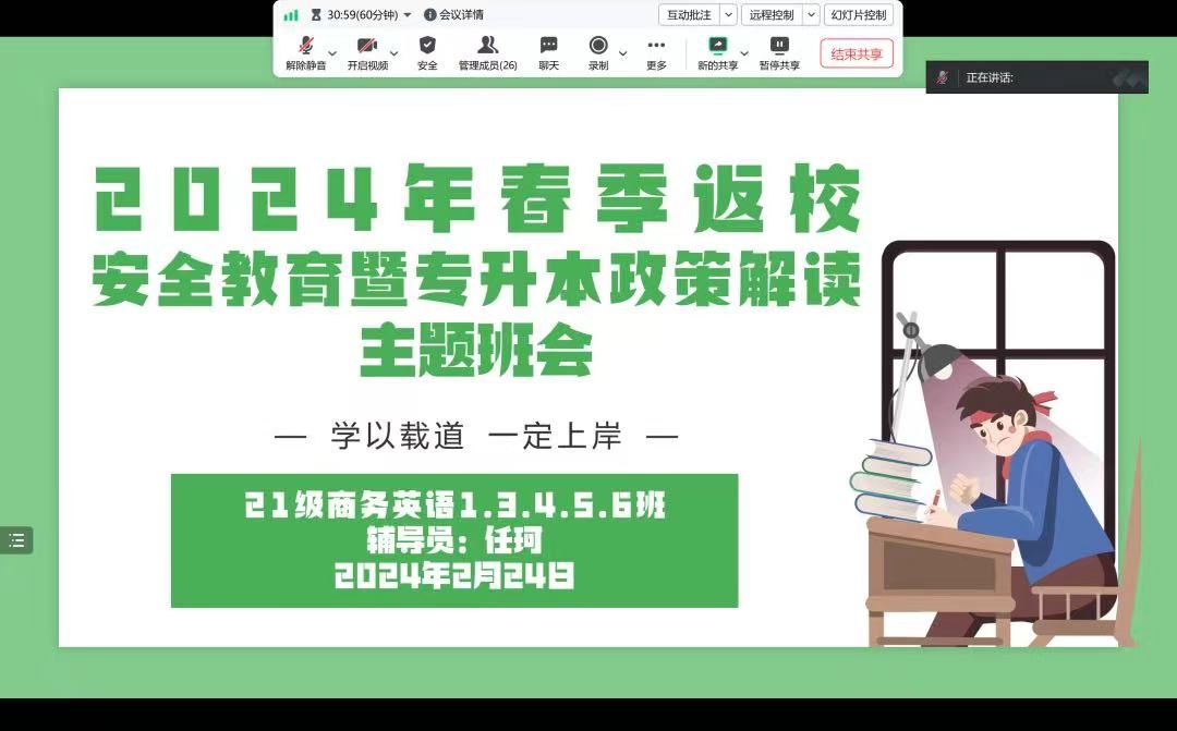同时,毕业班辅导员老师针对毕业实习、就业创业和专升本考试再次做了动员,针对当前就业形势进一步分析,建议大家结合个人学习能力、心理状态、综合素质各角度明确目标并积极行动,树立“先就业,再择业”的正确就业观。专科辅导员老师就专升本考试政策和关键时间节点做了明确说明,叮嘱同学们牢记时间节点,认真做好最后冲刺复习。