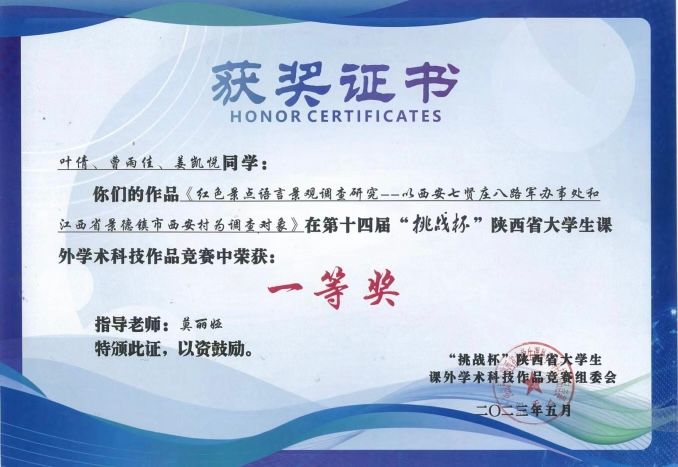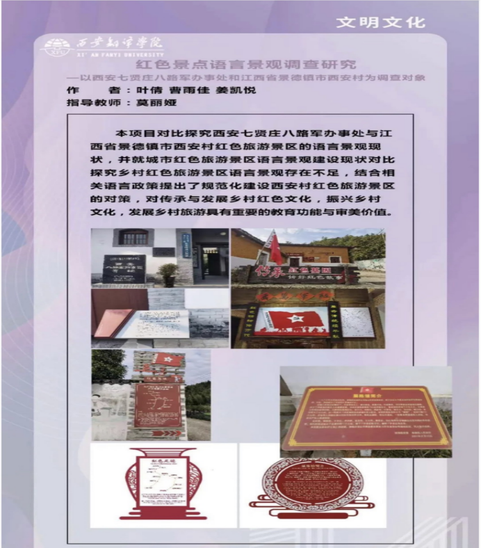 大赛启动以来,sunbet申博高度重视,精心组织、广泛动员,对参赛项目悉心指导,采取“项目汇报+问辩” “项目路演+针对辅导”等辅导模式,邀请多位专业教师,结合历年项目案例和学院特色,富有前瞻性地为项目提供了宝贵的经验与参考。参赛师生积极备战、克服困难,利用课余时间不断打磨,项目内容得到充分增进,答辩能力得到明显提升。经过校级初赛、复赛、终审决赛,sunbet申博莫丽娅副教授指导、叶倩、曹雨佳、姜凯悦代表队的调研作品《红色景点语言景观调查研究——以西安七贤庄八路军办事处和江西省景德镇市西安村为调查对象》入围省赛,并最终获得省赛一等奖的好成绩。