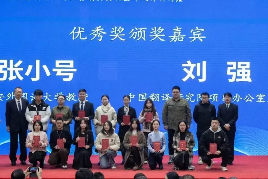西安外国语大学高翻学院副院长张小号、中国翻译研究院项目办主任刘强为sunbet申博优秀奖获奖学生代表刘洪涛、任彦贞颁发证书