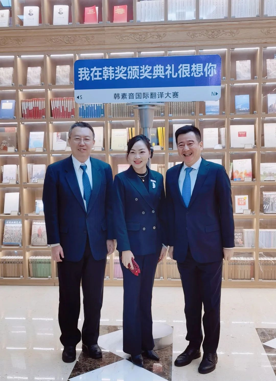 中国外文局中东欧与中南亚传播中心(人民画报社)主任、中国翻译协会副会长姜永钢,中国翻译研究院项目办主任刘强和西安翻译协会副理事长方馨合影留念