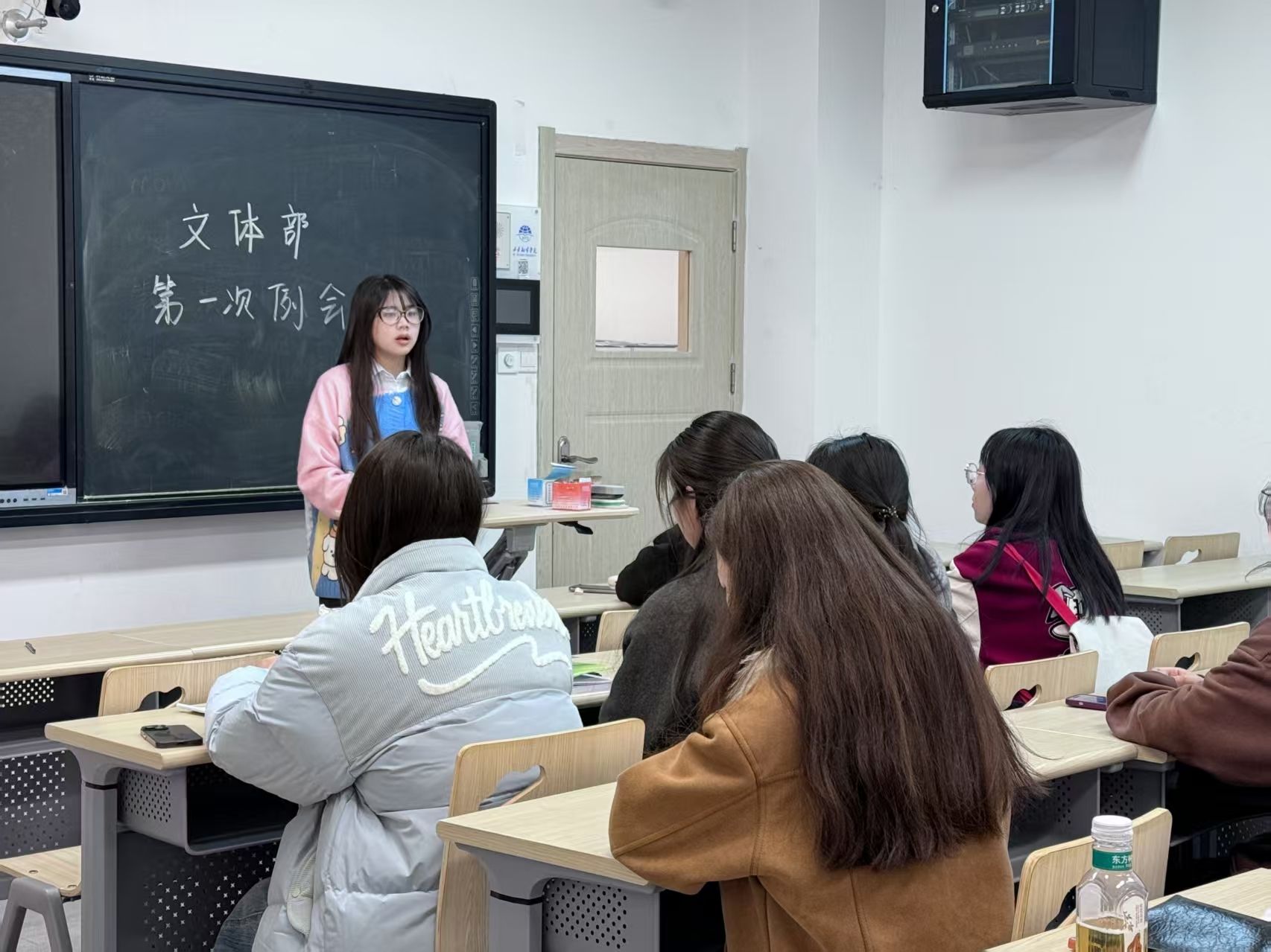 文体部部长谢周煊回顾了上学期的工作,客观分析了活动过程中存在的不足,并提出了改进方向。她号召部门干事积极参与本学期即将开展的各项文体活动,丰富同学们的校园生活,营造积极向上的文化氛围。