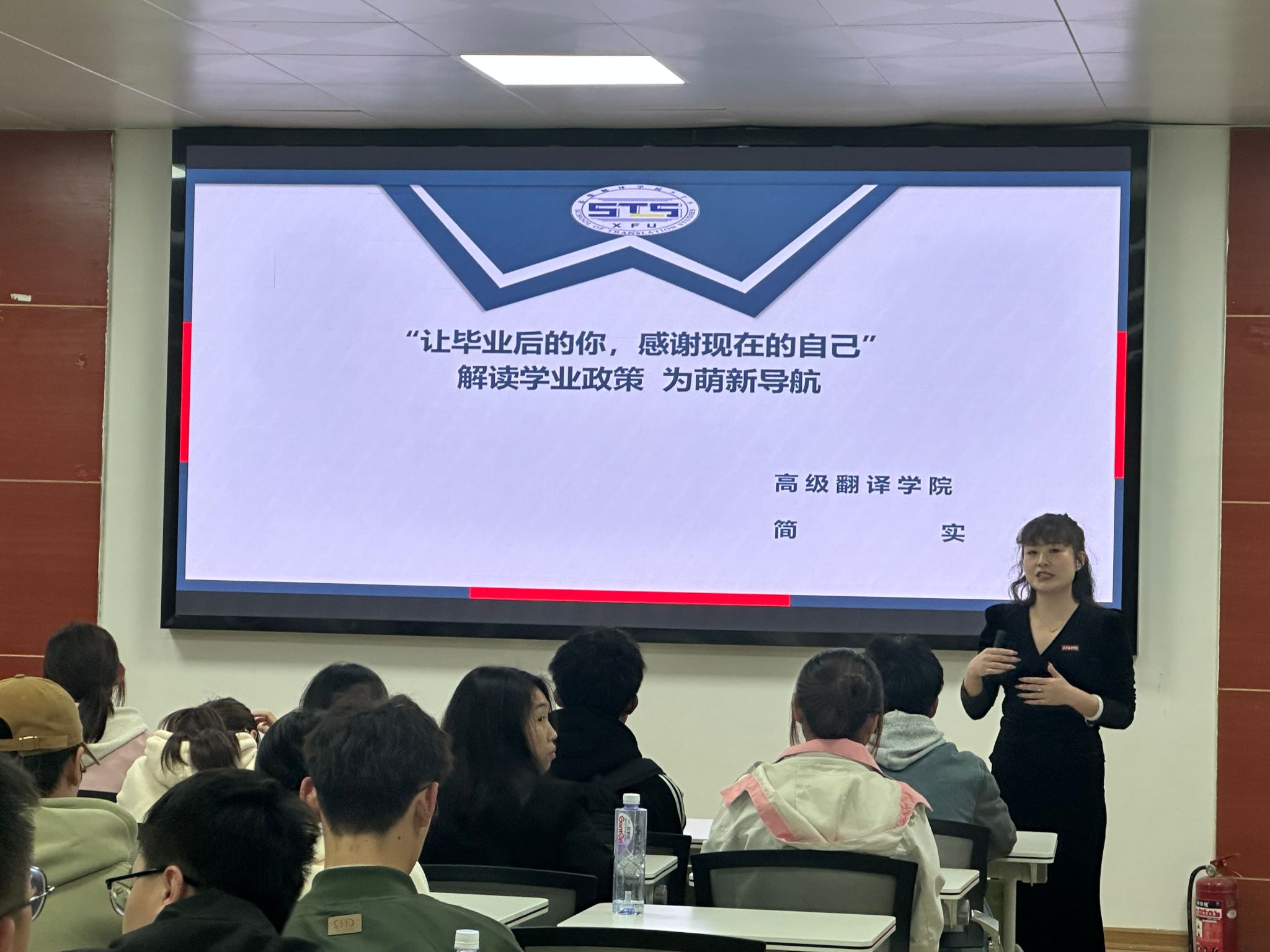为进一步做好新生入学教育工作,帮助翻译专业2023级新生更好地制定学业规划、明确学习目标、明确纪律,加强专业认知度,能够更快融入大学生活,开启人生的新征途,10月18日高级翻译学院综合办主任简实围绕学业政策开展了题为:“让毕业后的你,感谢现在的自己”——解读学业政策 为萌新导航的入学教育讲座,旨在帮助新生顺利过渡到大学学习生活中,明确自己的学业目标。